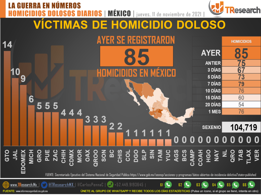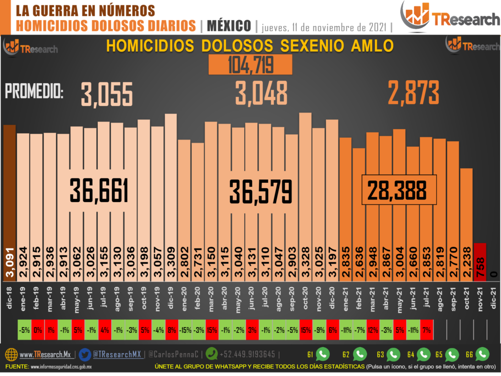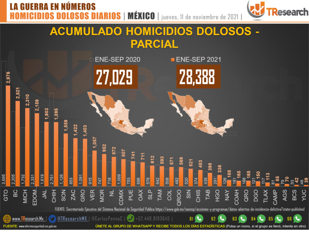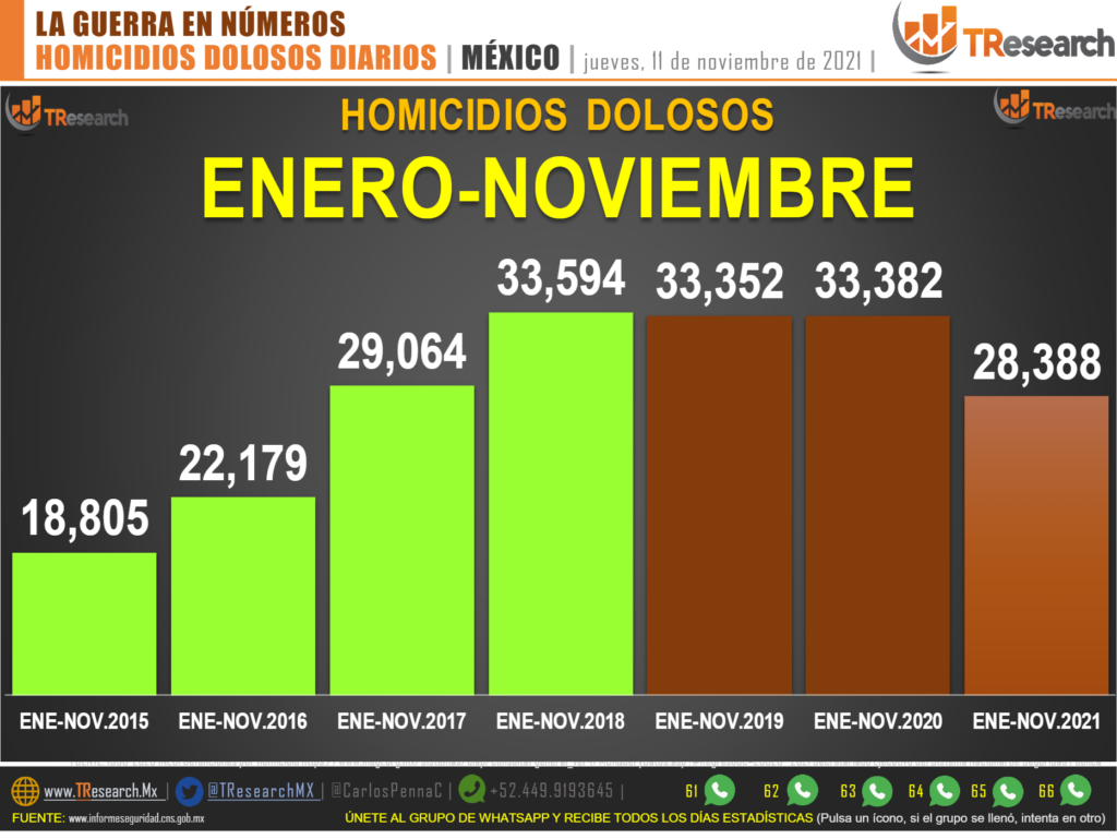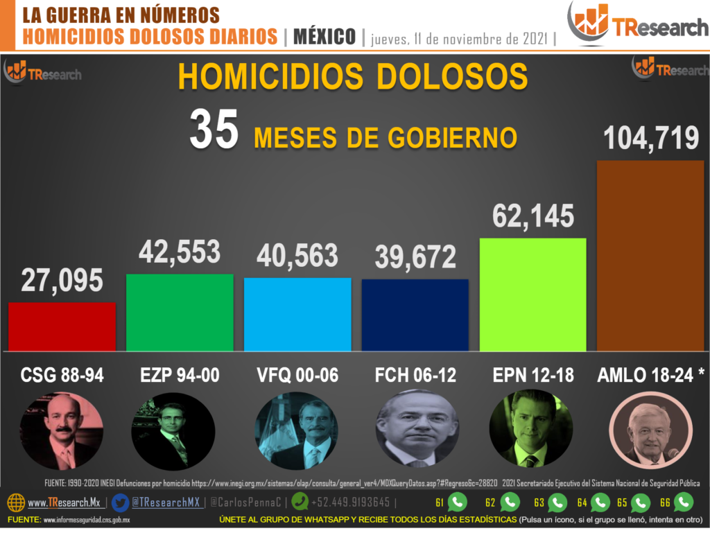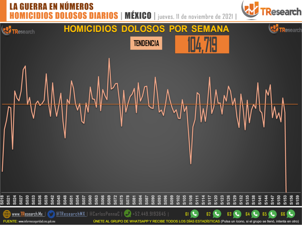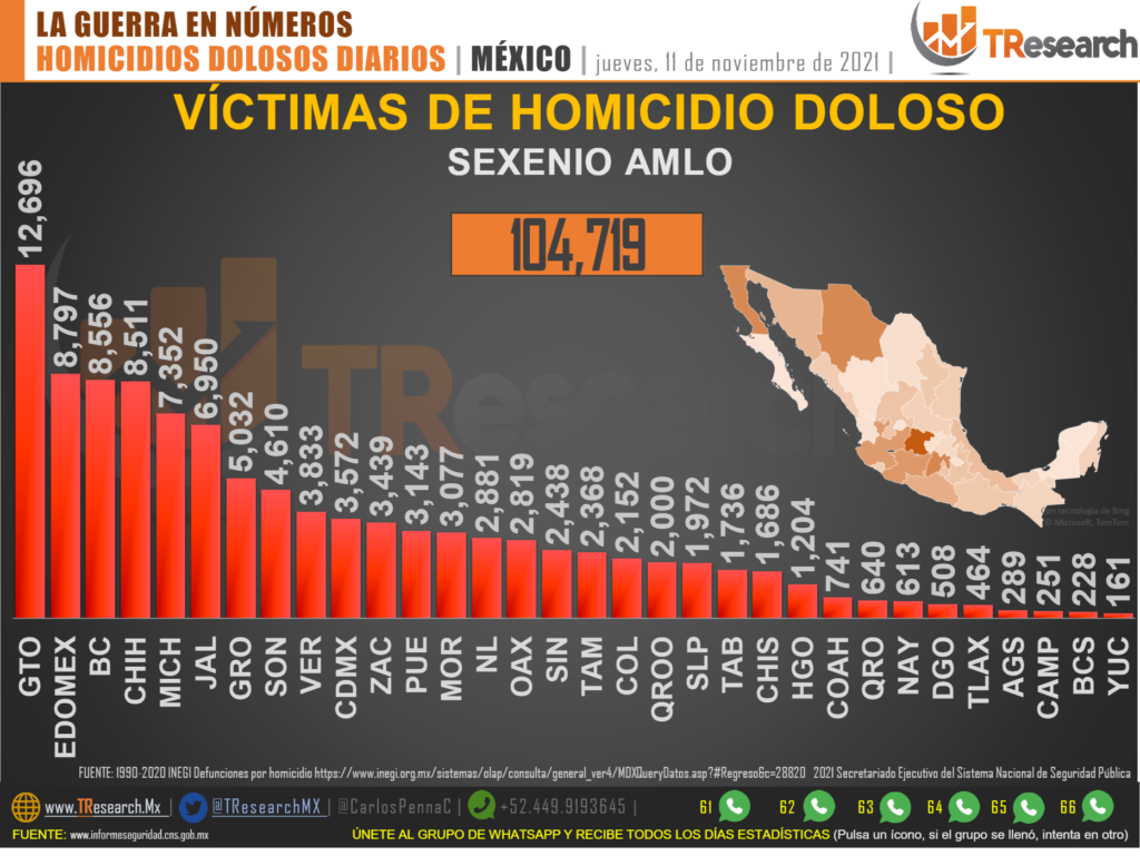El reporte ‘MX: La Guerra en Números’, de T-ResearchMX, detalla que, de acuerdo con el registro de homicidios dolosos de la Secretaría de Seguridad y Protección Ciudadana, del 1 de diciembre de 2018 al 10 de noviembre de 2021, tiempo que lleva la actual Administración del presidente Andrés Manuel López Obrador, las fiscalías estatales y federales han registrado 104 mil 719 homicidios dolosos en México.