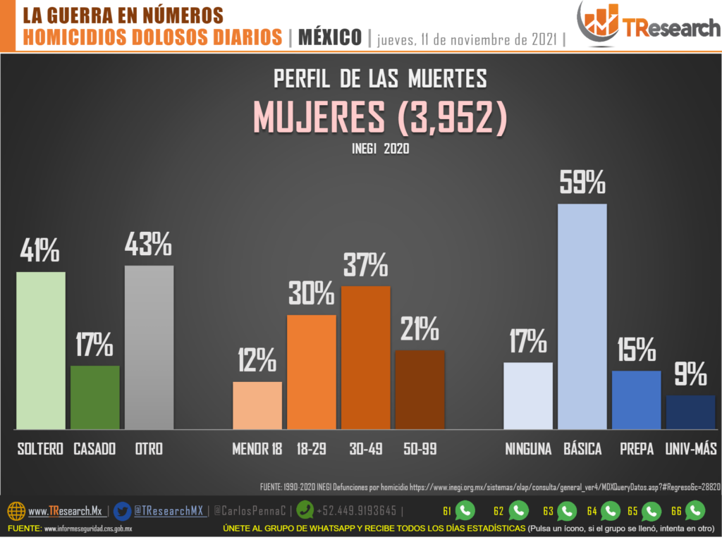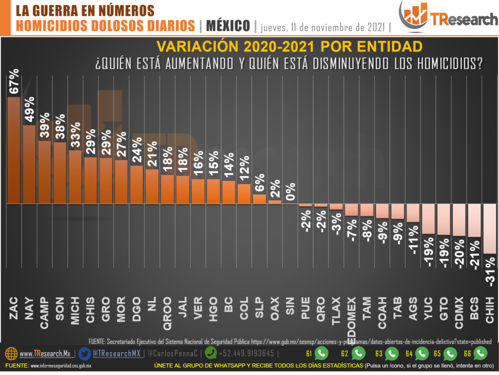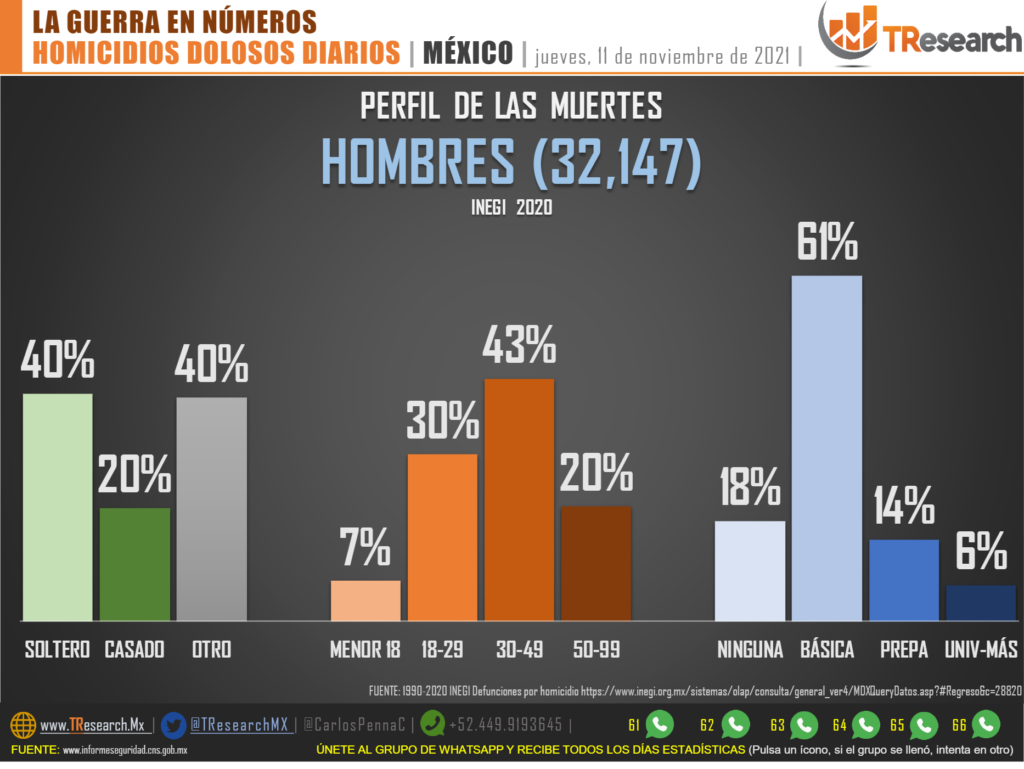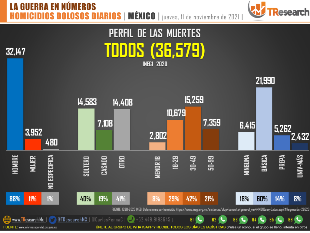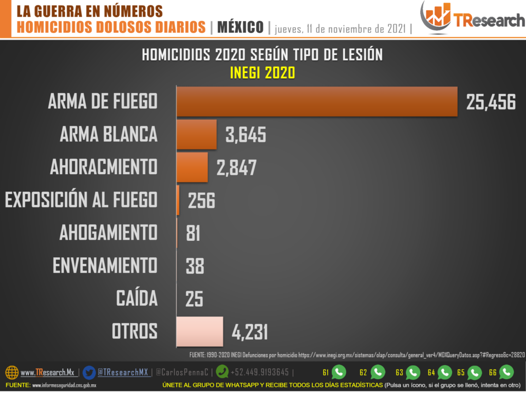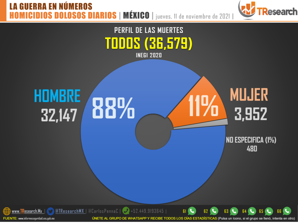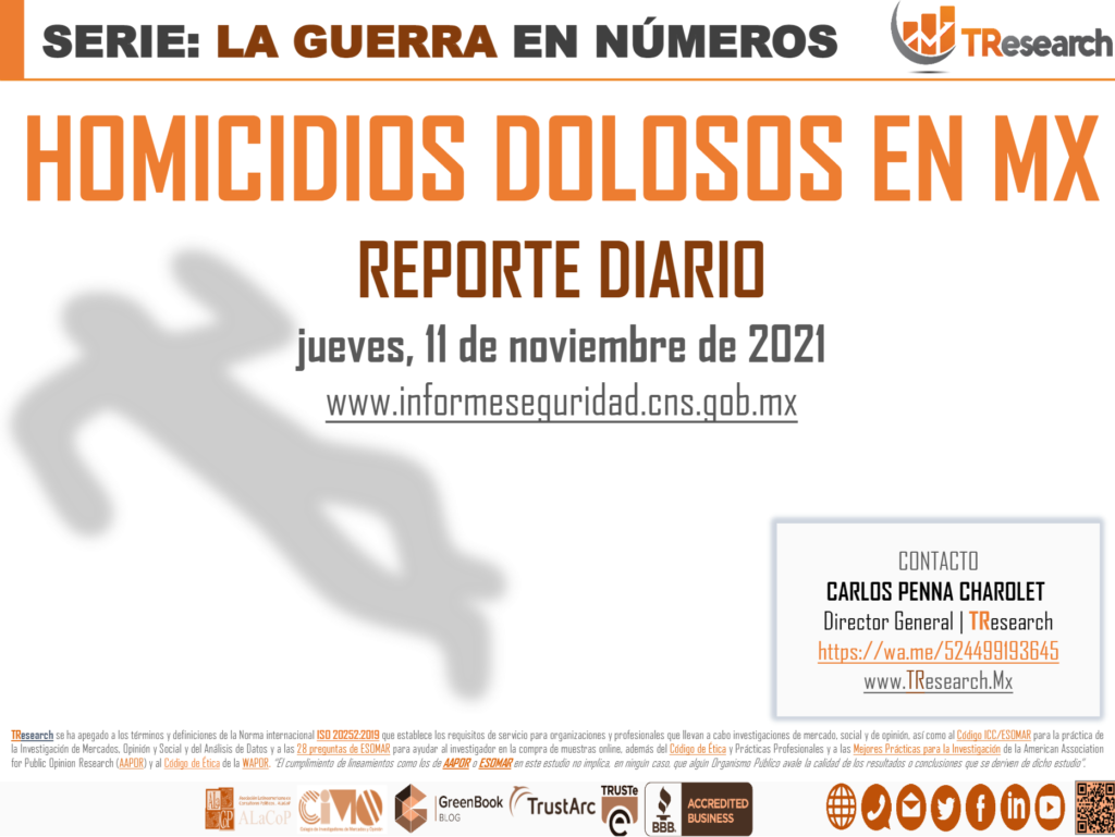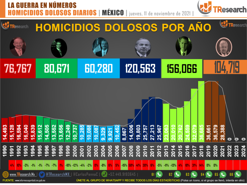 El reporte ‘MX: La Guerra en Números’, de T-ResearchMX, detalla que, de acuerdo con el registro de homicidios dolosos de la Secretaría de Seguridad y Protección Ciudadana, del 1 de diciembre de 2018 al 10 de noviembre de 2021, tiempo que lleva la actual Administración del presidente Andrés Manuel López Obrador, las fiscalías estatales y federales han registrado 104 mil 719 homicidios dolosos en México.