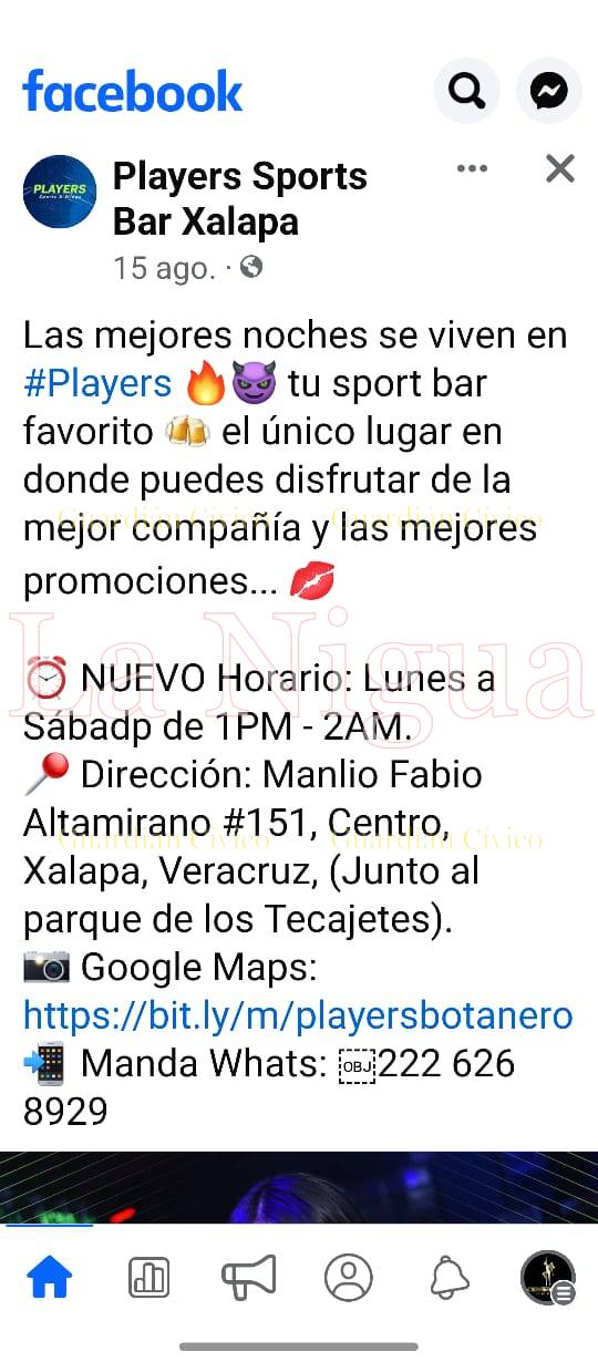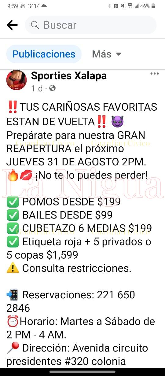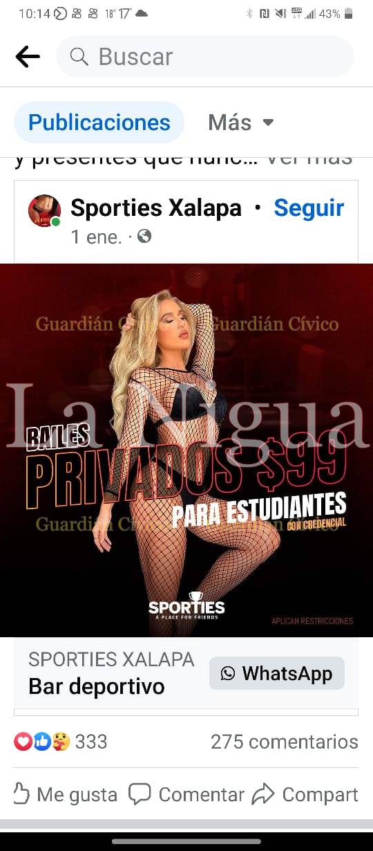 “Players” opera en la calle de Altamirano número 151, a un costado de la Escuela Motolinía, sin problema de horario, mientras “Sporties Xalapa” se localiza en la Avenida Circuito Presidentes #320 de la colonia Zapata, ambos con permiso para operar con el giro de Restaurant-Bar, aunque descaradamente lo menos que ofrecen es venta de comida pues en su publicidad claramente especifican que su giro es “Table Dance”, irregularidad que para las autoridades de comercio, curiosamente, no se han dado cuenta o no quieren darse cuenta.