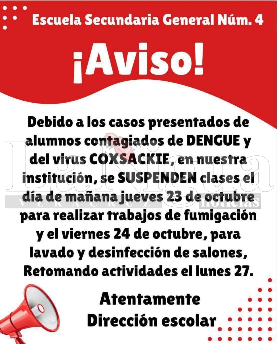 La Escuela Secundaria General Número 4, ubicada en la colonia Las Delicias, suspendió clases los días jueves 23 y viernes 24 de octubre para llevar a cabo una jornada integral de limpieza, sanitización y fumigación en sus instalaciones, luego de que se reportaran casos de dengue y virus coxsackie entre su población estudiantil.