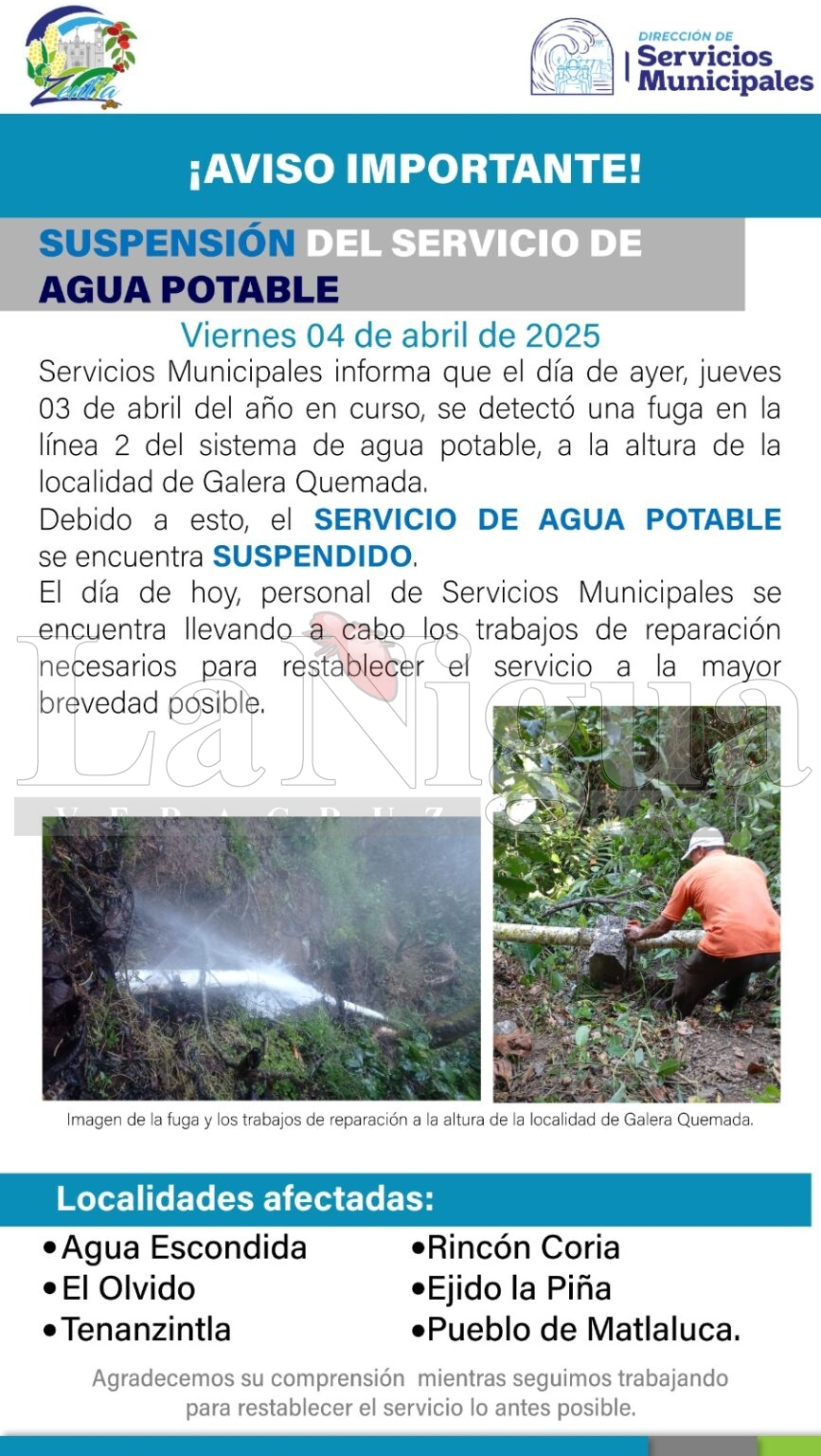 Zentla, Ver., 4 de abril de 2025 — La Dirección de Servicios Municipales del Ayuntamiento de Zentla informó sobre la suspensión temporal del servicio de agua potable debido a una fuga detectada en la línea 2 del sistema, a la altura de la localidad de Galera Quemada.