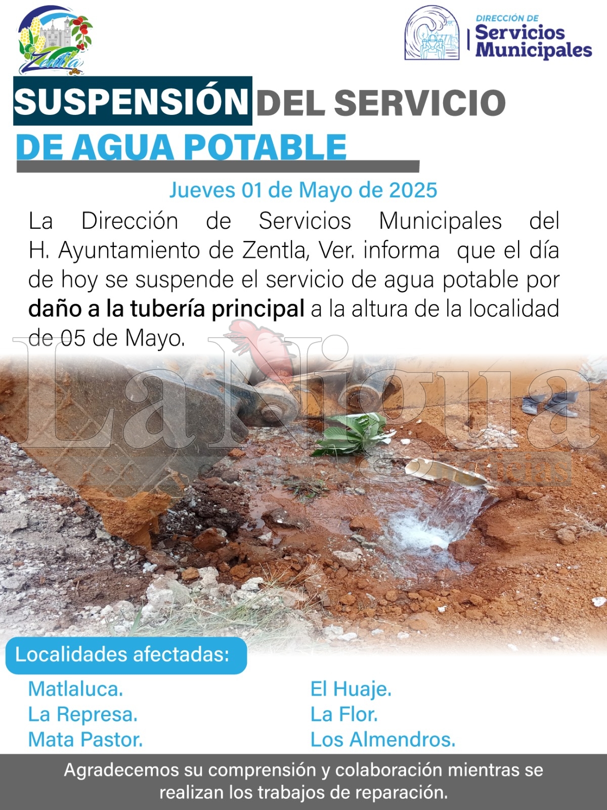 Zentla, Ver. – La Dirección de Servicios Municipales del H. Ayuntamiento de Zentla informó que este jueves 1 de mayo de 2025 se suspenderá el servicio de agua potable en diversas localidades del municipio debido a un daño en la tubería principal, ocurrido a la altura de la localidad de 05 de Mayo.