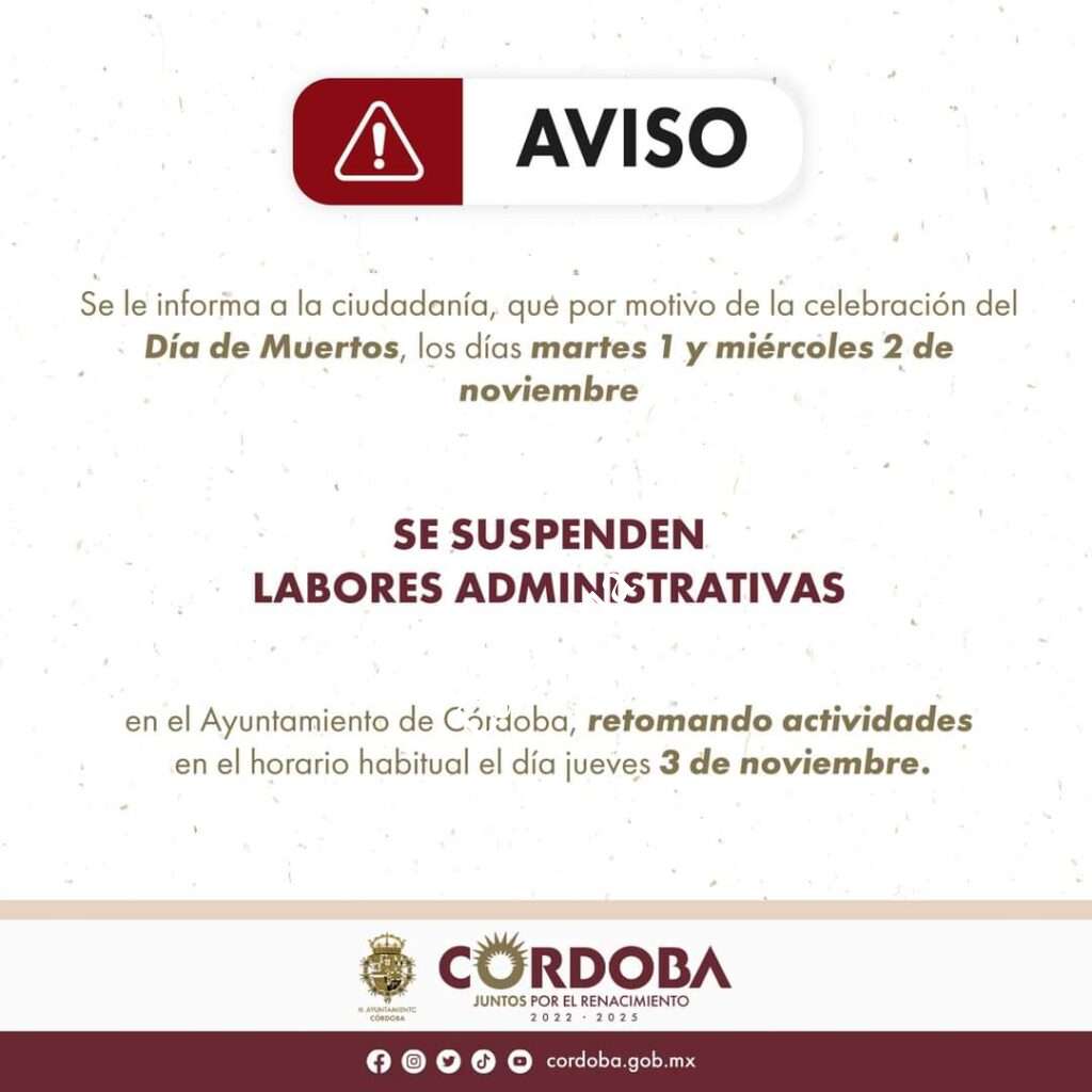 Córdoba, Ver., (31 de octubre de 2022). – Este 1 y 2 de noviembre, el Ayuntamiento de Córdoba suspenderá labores administrativas, sin embargo, la Limpia Pública trabajará con normalidad.