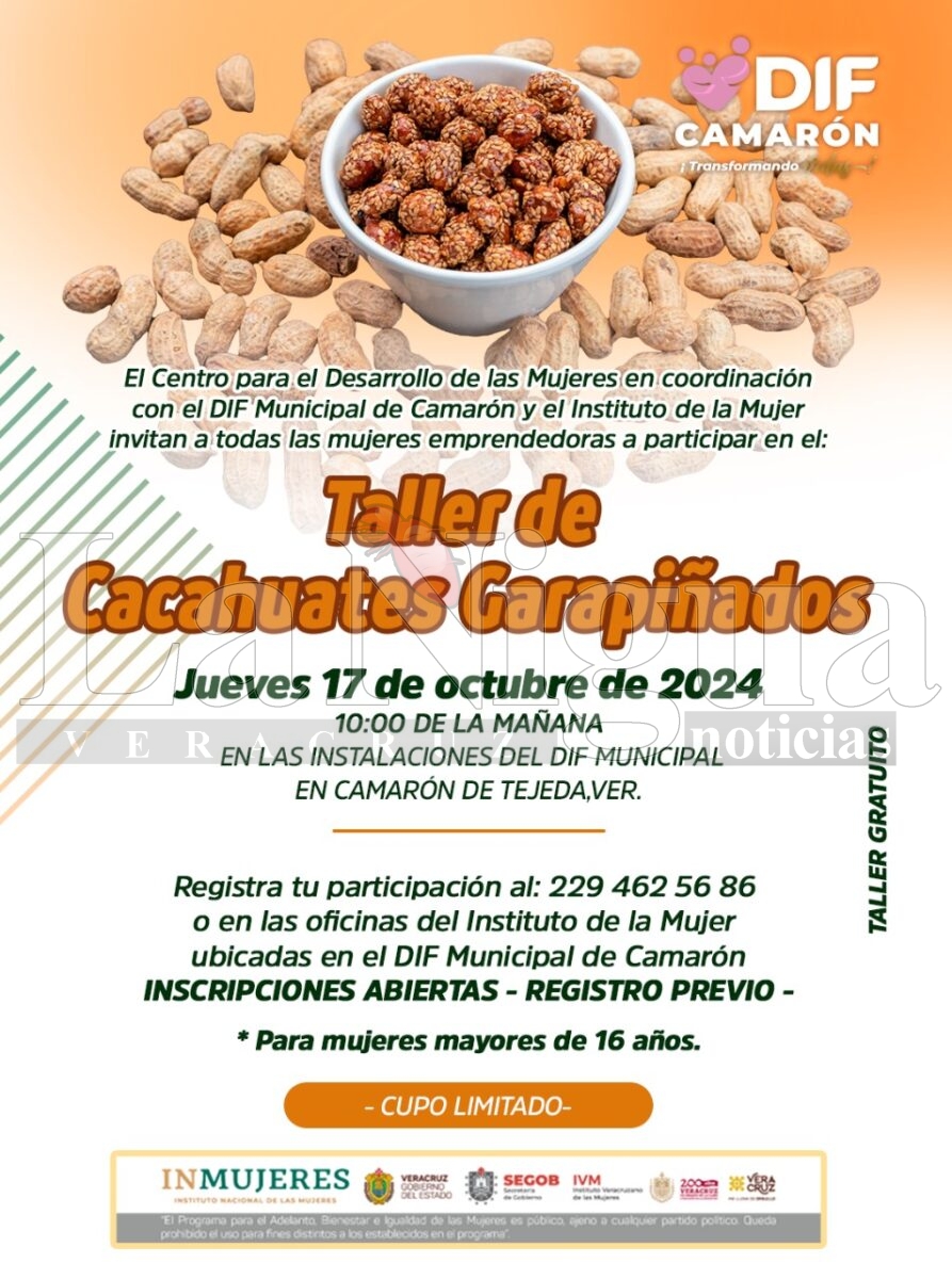 Camarón de Tejeda, Veracruz. – El Centro para el Desarrollo de las Mujeres, en colaboración con el DIF Municipal de Camarón y el Instituto de la Mujer, invita a todas las mujeres emprendedoras a participar en un interesante Taller de Cacahuates Garapiñados. Este evento se llevará a cabo el jueves 17 de octubre de 2024 a las 10:00 de la mañana en las instalaciones del DIF Municipal.