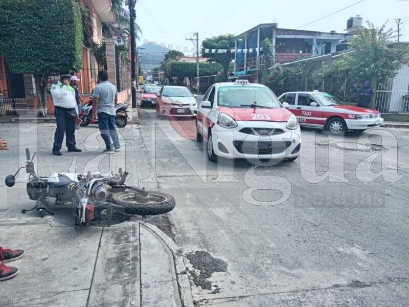 Catemaco, Ver.-Alrededor de las 09:00 horas de este miércoles se registró un percance vial, esto en el cruce de las calles Ocampo y Zamora, donde participó una motocicleta marca Honda 150, de color blanco, sin placas de circulación y, un vehículo marca March, sin placas de circulación, este habilitado para prestar el servicio en la modalidad de taxi marcado con el número económico 203.