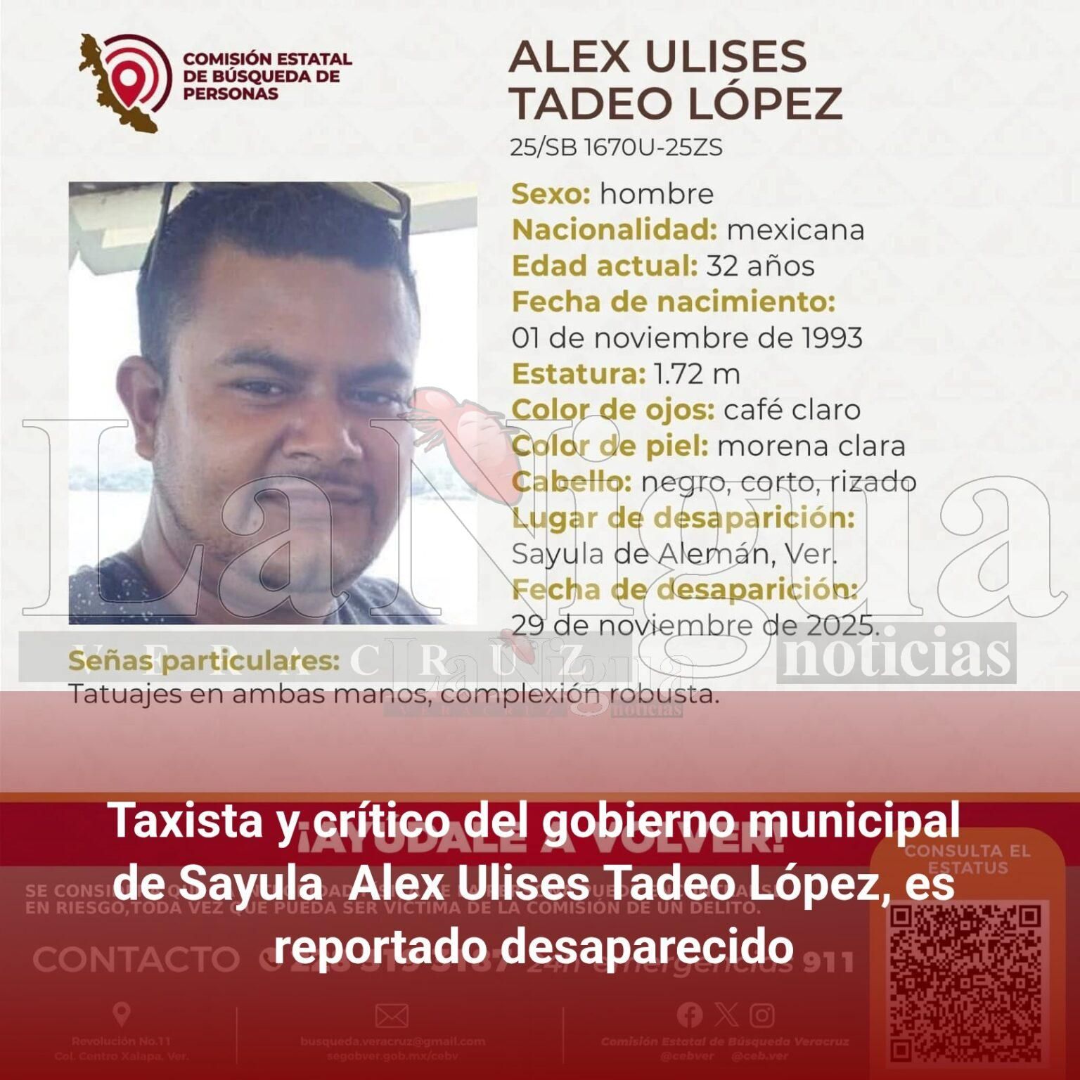 Alex Ulises Tadeo López, conocido como El Kalimba, fue reportado como desaparecido en Sayula de Alemán, luego de que este sábado por la tarde se perdiera todo rastro del conductor de 32 años, quien trabajaba en la unidad 68 de Sayula.