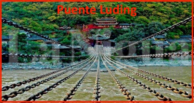 “viramos la vista hacia el puente. No era de piedra, tampoco de madera, sólo había trece cadenas de hierro con eslabones que semejaban roscones (aros). Un par de ellas, a cada lado, hacían las veces de pretiles. Las otras nueve, servían de apoyo a los tableros que habían sido desmantelados por los nacionalistas que avanzaban en la orilla opuesta del río Dadu. Ellos encendieron antorchas; nosotros hicimos lo mismo para engañarlos que éramos amigos. Poco después apagamos las antorchas, nos apresuramos y los dejamos atrás confiados y agotados. En la entrada del puente un comando formado por 24 hombres (portando granadas) avanzó por el desvencijado puente bajo el fuego enemigo hasta tomarlo”.