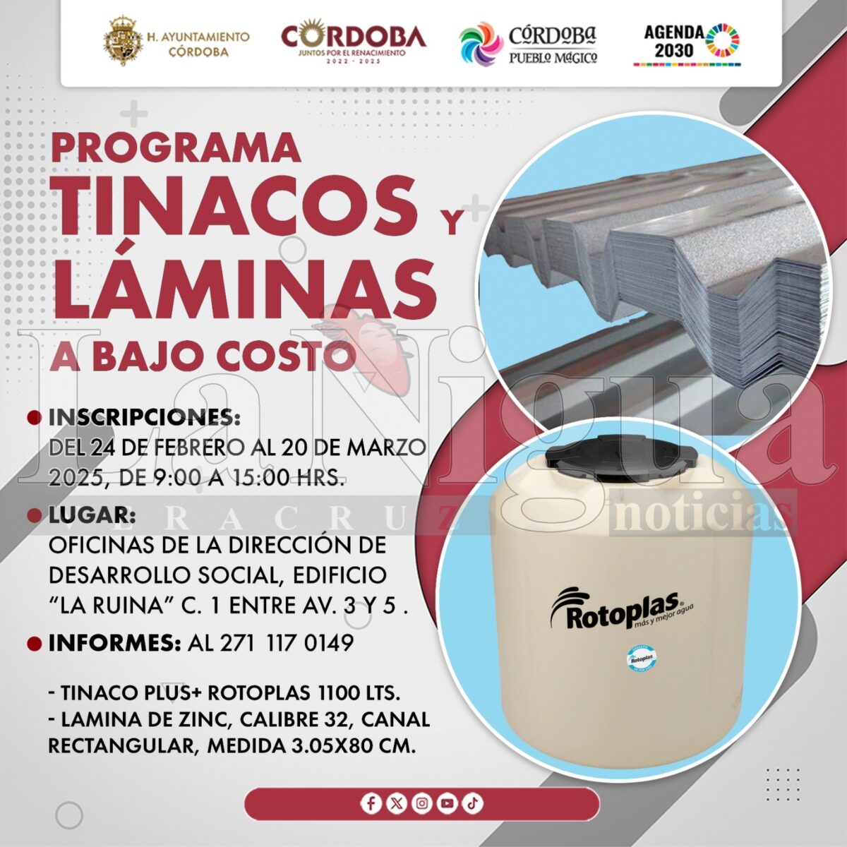 Córdoba, Ver. 27 de febrero de 2025.- La dirección de Desarrollo Social del Ayuntamiento continúa gestionando programas sociales en beneficio de la ciudad, al aperturar las inscripciones para adquirir tinacos y láminas a bajo costo.