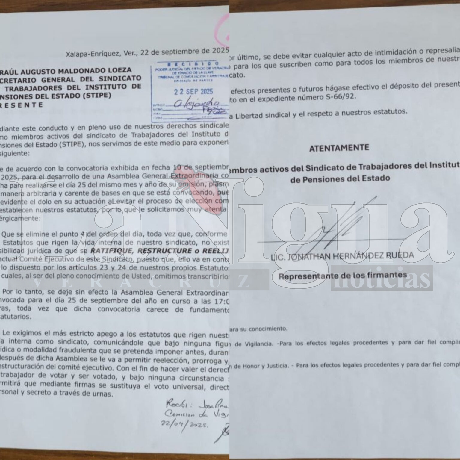 Veracruz, Ver.- Trabajadores agremiados al Sindicato de Trabajadores del Instituto de Pensiones del Estado (Stipe) solicitaron formalmente mediante oficio al Tribunal de Conciliación y Arbitraje (TCA) frenar lo que califican como un abuso de autoridad por parte del actual Comité Ejecutivo, el cual busca reelegirse por tercer periodo consecutivo sin legalidad alguna como lo hiso la segunda vez