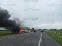 El accidente ocurrió a las 07:00 horas de este domingo sobre la carretera Victoria-Zaragoza, dónde colisionaron un tractocamión y una camioneta tipo VAN donde presuntamente quedaron calcinadas más de 8 personas y fuera de la camioneta una mujer y un bebé.