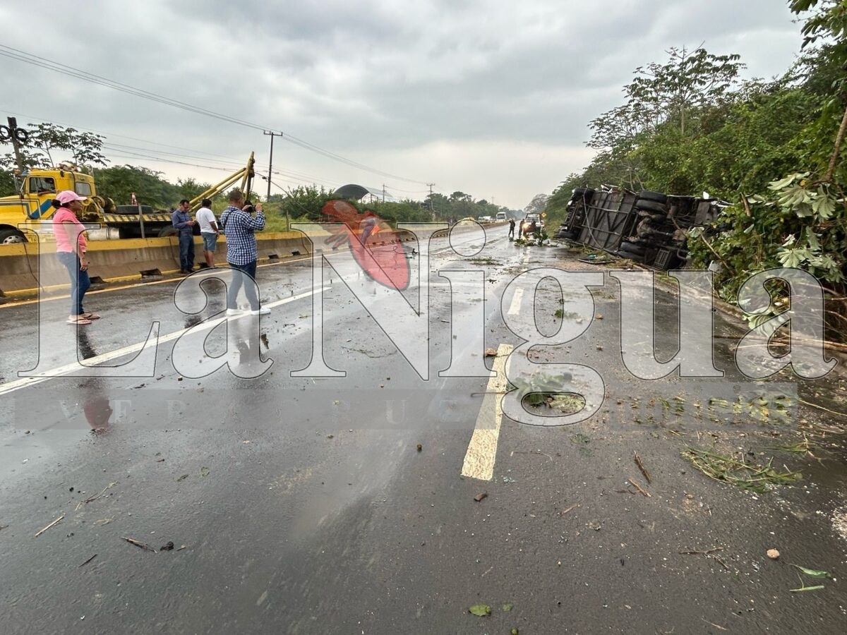Texistepec, Ver. – Una mujer muerta y más de una veintena de lesionados, es el saldo de la volcadura de un autobús de la línea Sotavento, durante el mediodía de este miércoles cinco de marzo, al momento en que transitaba sobre la carretera Transístmica Acayucan- Jáltipan, al sur del estado de Veracruz.