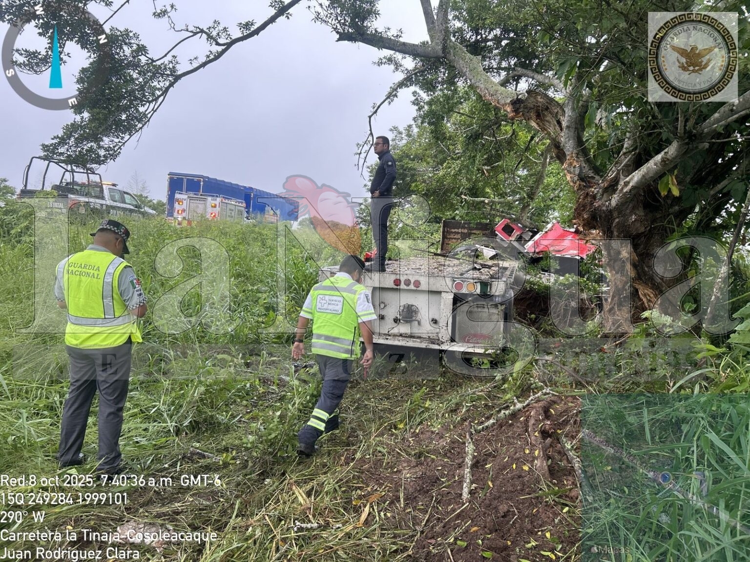 La circulación permanece cerrada con dirección a Cosamaloapan, mientras personal de la Guardia Nacional y CAPUFE realiza maniobras en el área, en espera de la llegada de Servicios Periciales para llevar a cabo las diligencias correspondientes y retirar la unidad siniestrada.