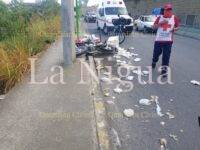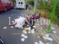 Como primer respondiente acudió la Policía Municipal, Cruz Roja y Bomberos, hallando en el lugar a un hombre tirado en el carril derecho con aparentes lesiones, el cual circulaba en una motocicleta Honda color roja, adaptada para la venta de tortillas.