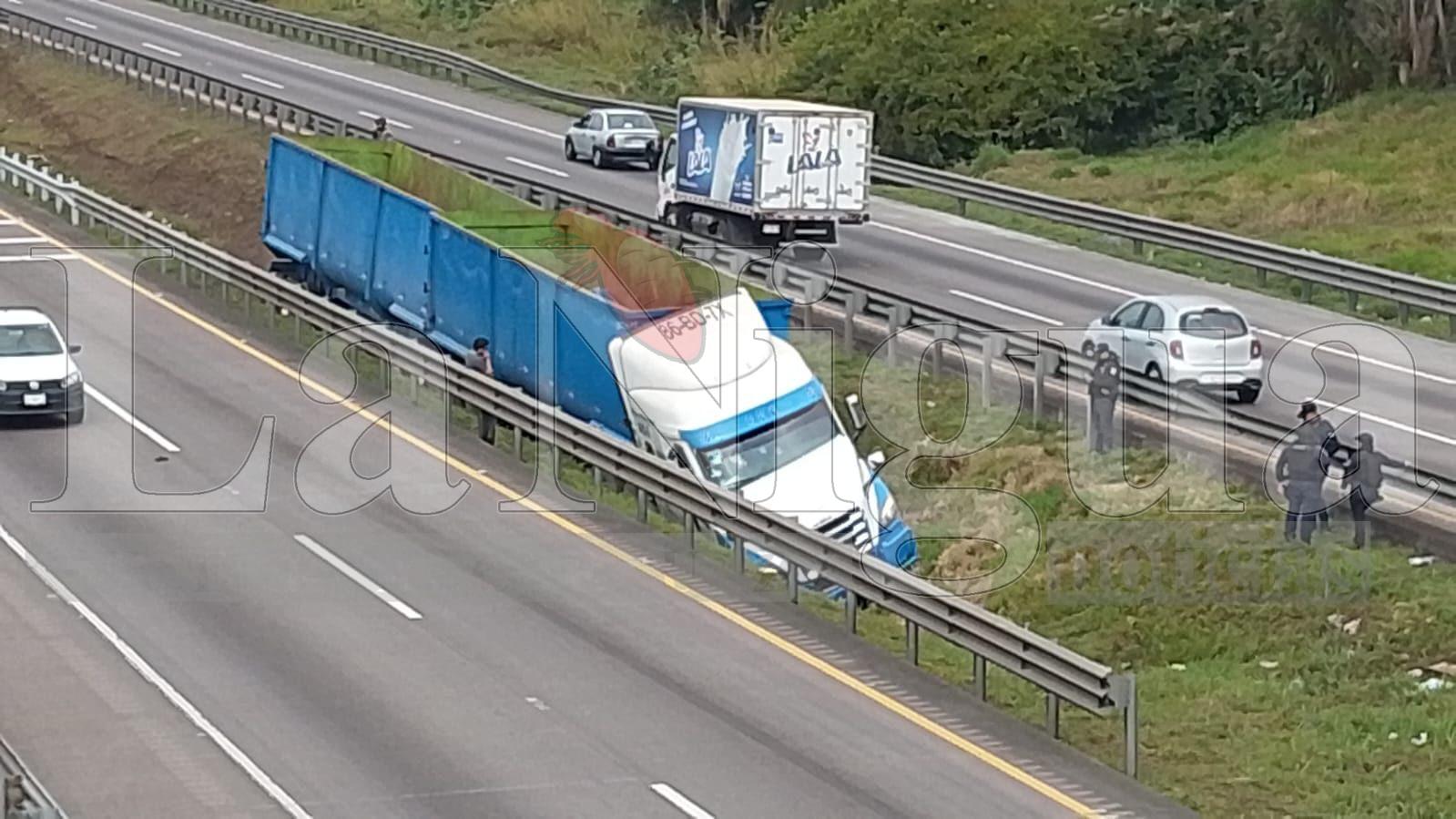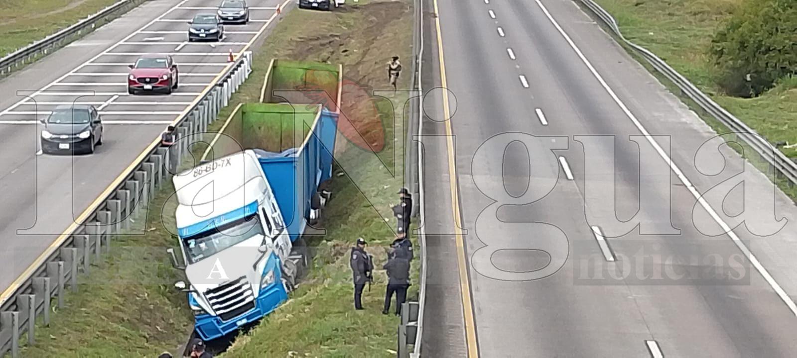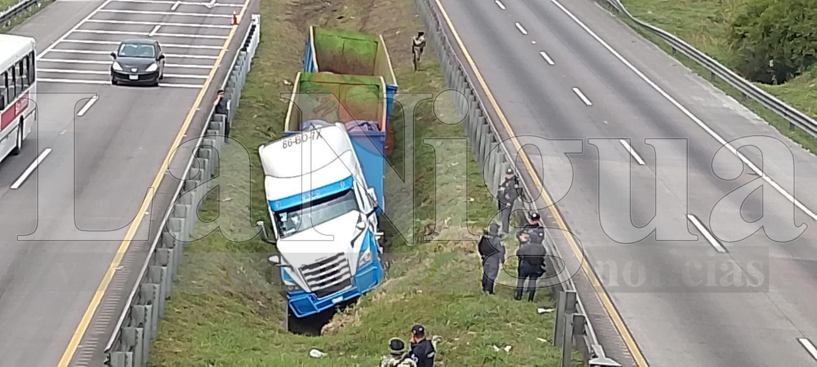 De acuerdo con los primeros reportes, la pesada unidad circulaba en descenso cuando, al llegar a una curva, presuntamente a causa de una falla mecánica, el conductor perdió el control, salió del camino e invadió el camellón central, para finalmente terminar en una zanja.