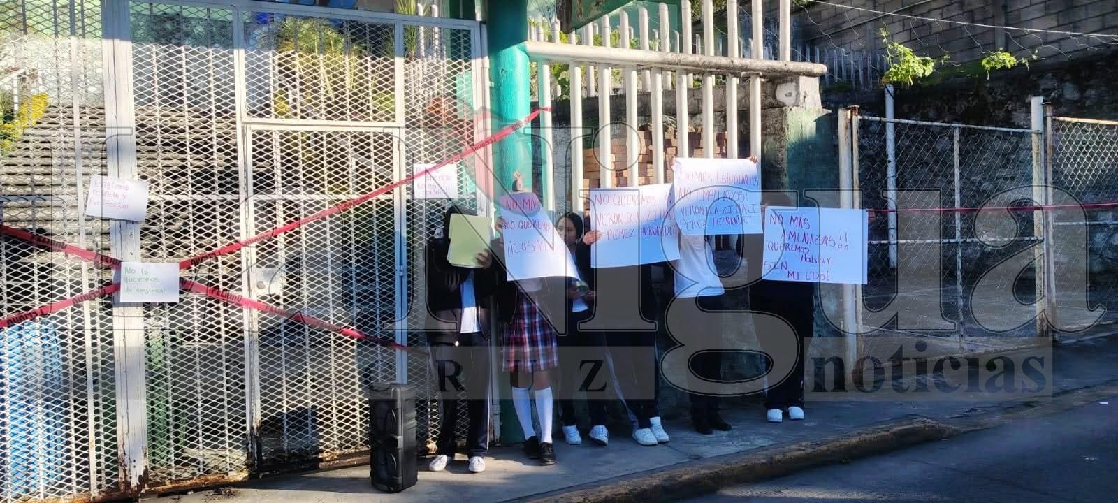 La manifestación inició tras el regreso de una docente que había permanecido cerca de un año fuera del plantel debido a una incapacidad médica. Los alumnos expresaron su inconformidad colocando cartulinas y consignas en el acceso a la institución, donde denunciaron presuntas actitudes prepotentes, amenazas y conductas indebidas dentro del aula.