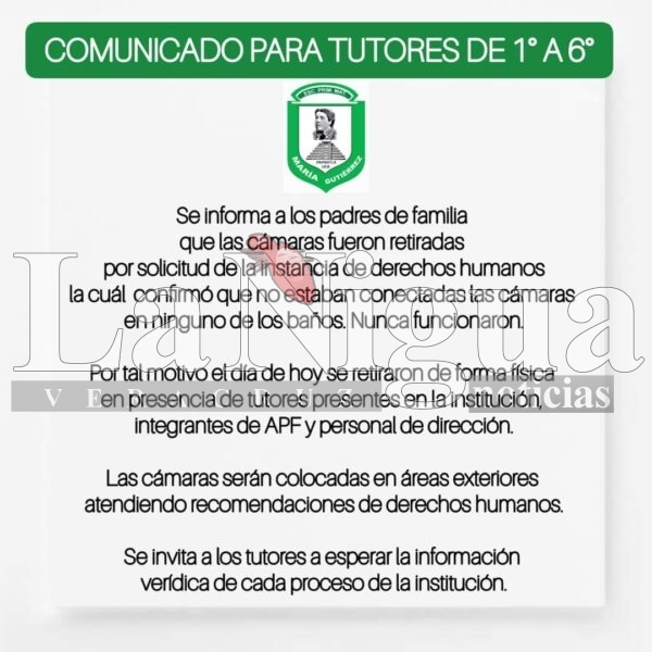 En su momento, la profesora Virginia López González, ordenó la instalación de cámaras de vigilancia, las cuales fueron colocadas en los sanitarios de niñas y niños cómo expresaron los quejosos.