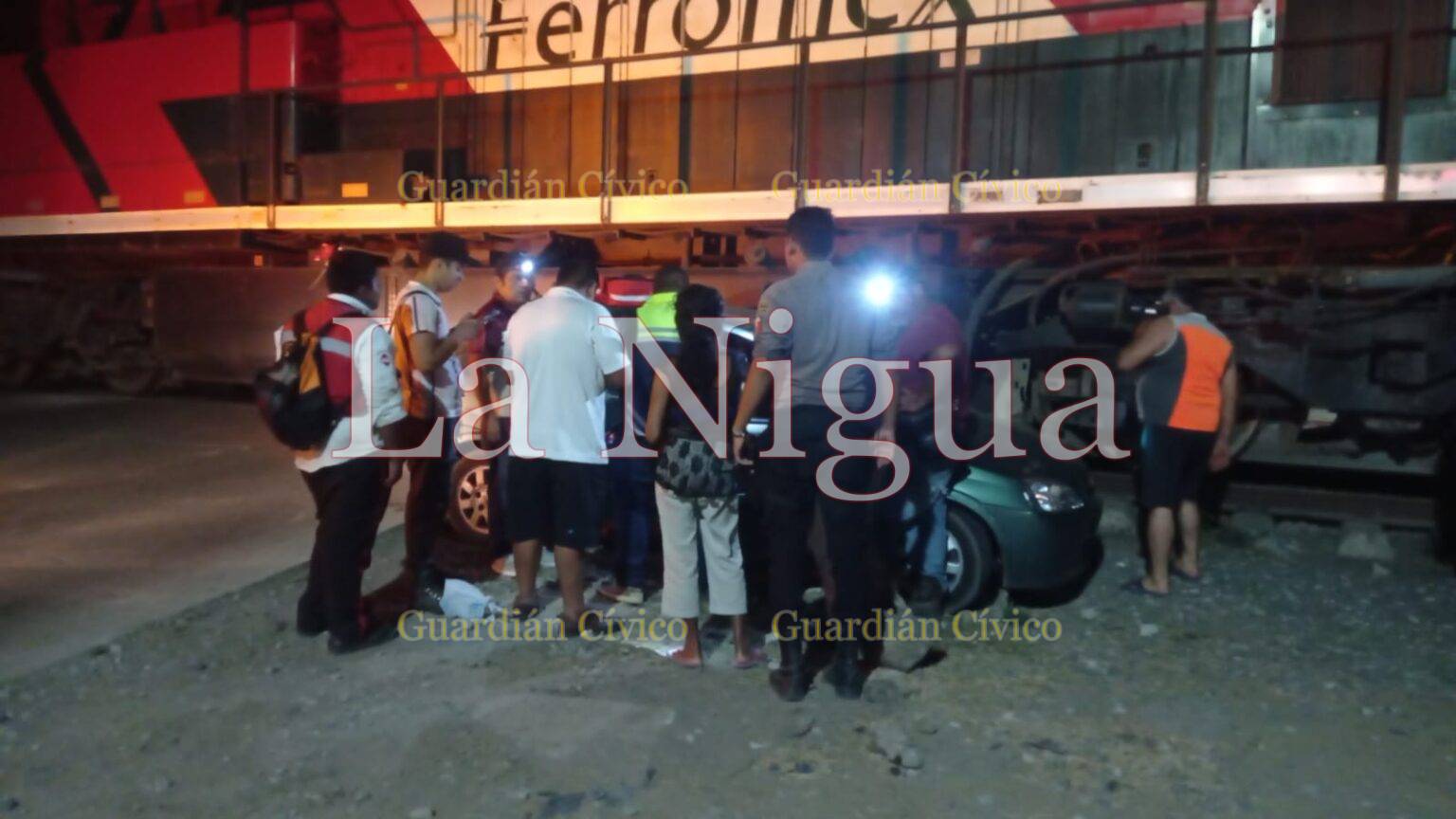 Tremendo susto se llevó el conductor de un automóvil compacto al ser arrastrado por varios metros por el ferrocarril al intentar ganarle el paso.