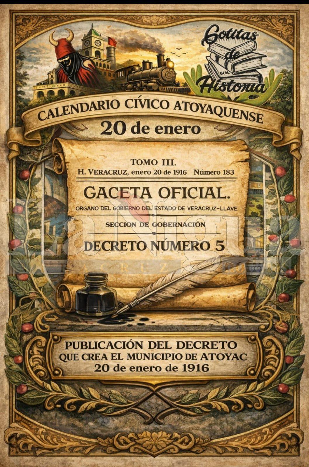 El 12 de enero de 1916, el General Cándido Aguilar Vargas emite el Decreto número 5, mediante el cual se crea oficialmente el municipio de Atoyac, el documento no se queda en el escritorio, se ordena su publicación por Bando Solemne, como mandan las formas republicanas, para que el pueblo sepa, escuche y entienda que algo ha cambiado para siempre.