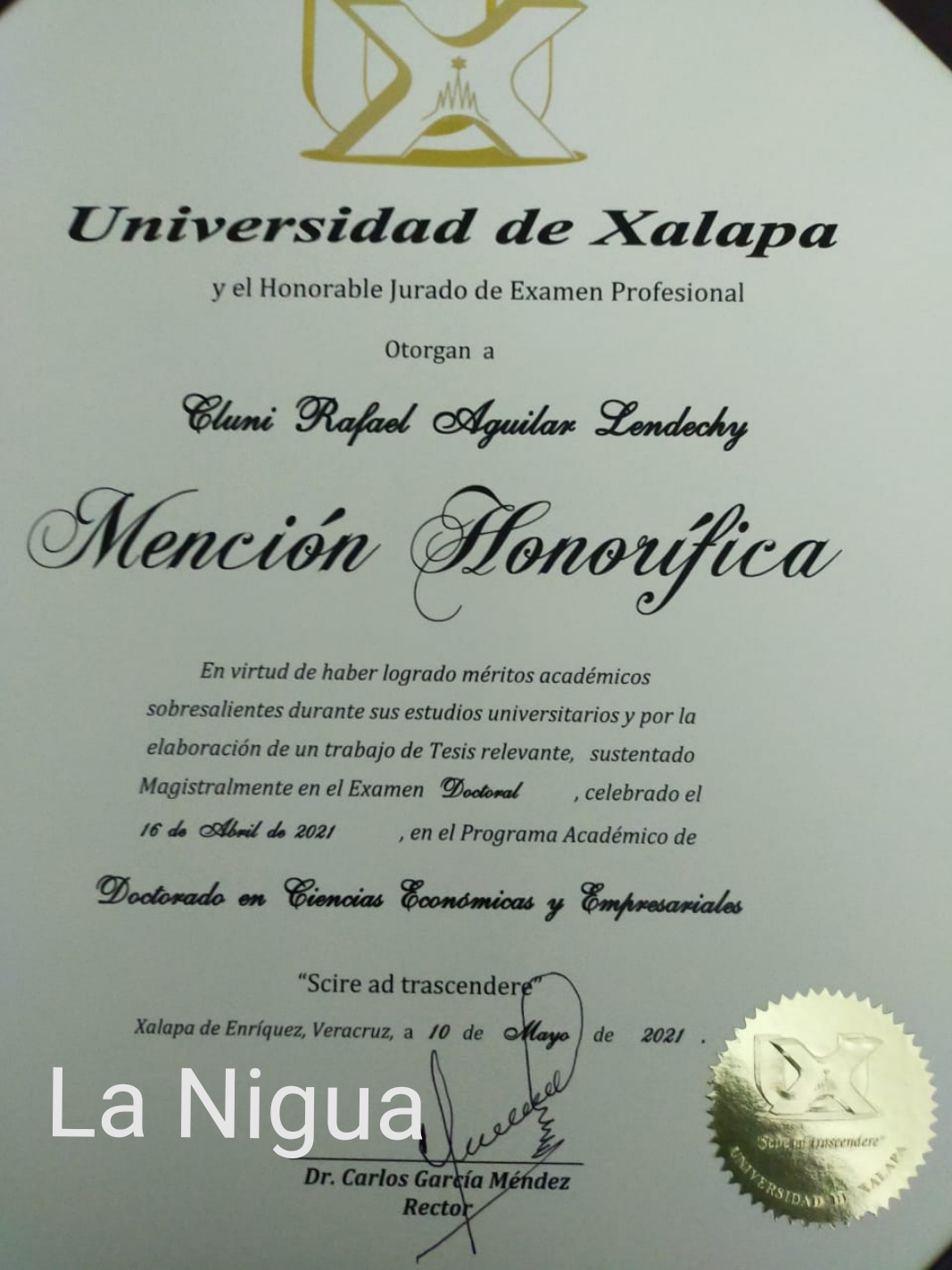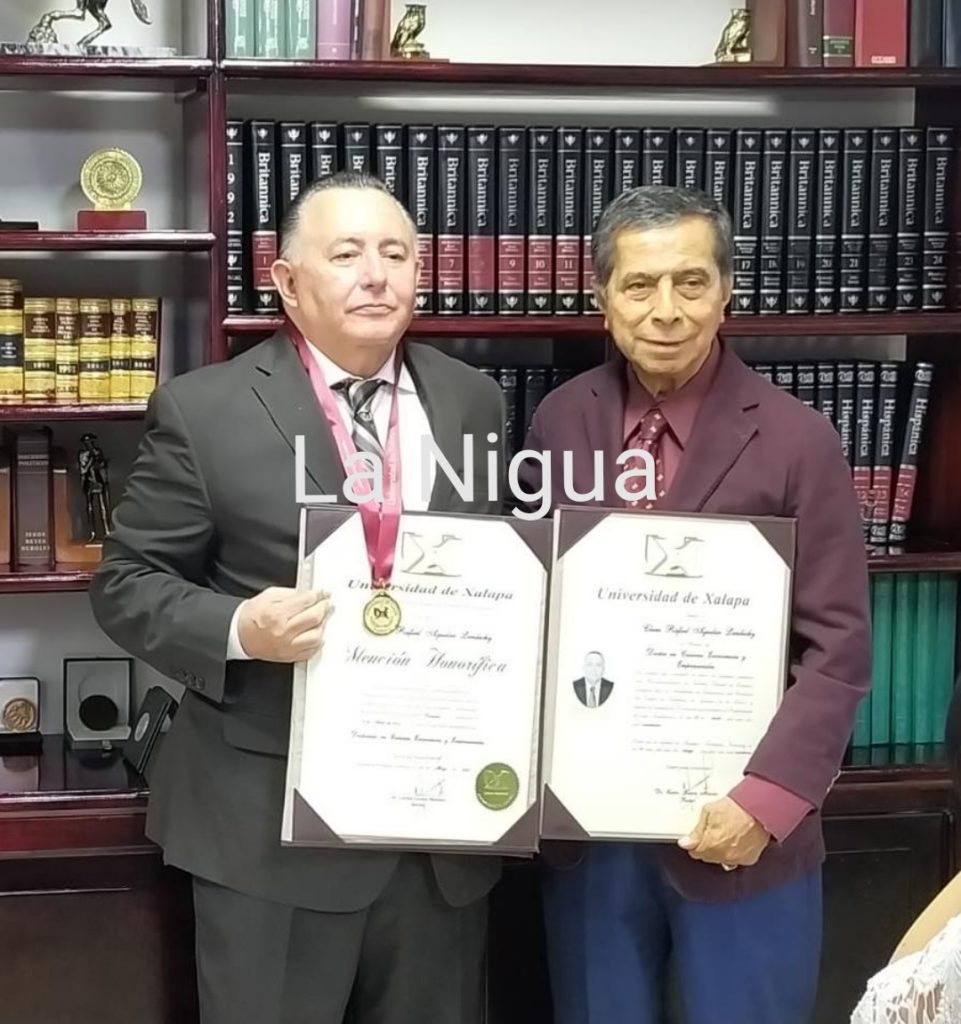 El doctor Cluni Rafael Aguilar Lendechy recibió el titulo de Doctor en Ciencias Económicas y Empresariales el pasado 3 de junio de manos del rector de la Universidad Xalapa, doctor Carlos García Méndez, además de recibir una Medalla de Mención Honorífica y Diploma de Mención Honorífica, cuenta también con otros posgrados como dos especialidades, dos maestrías y cinco doctorados, lo que le ha servido para brindar un mejor servicio en la institución donde labora.