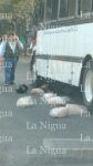 La moto quedó en la llanta delantera lateral derecha, y el conductor; repartidor de carnes frías quedó debajo del autobús, además de que los productos que lleveba quedaron tirados en el asfalto.