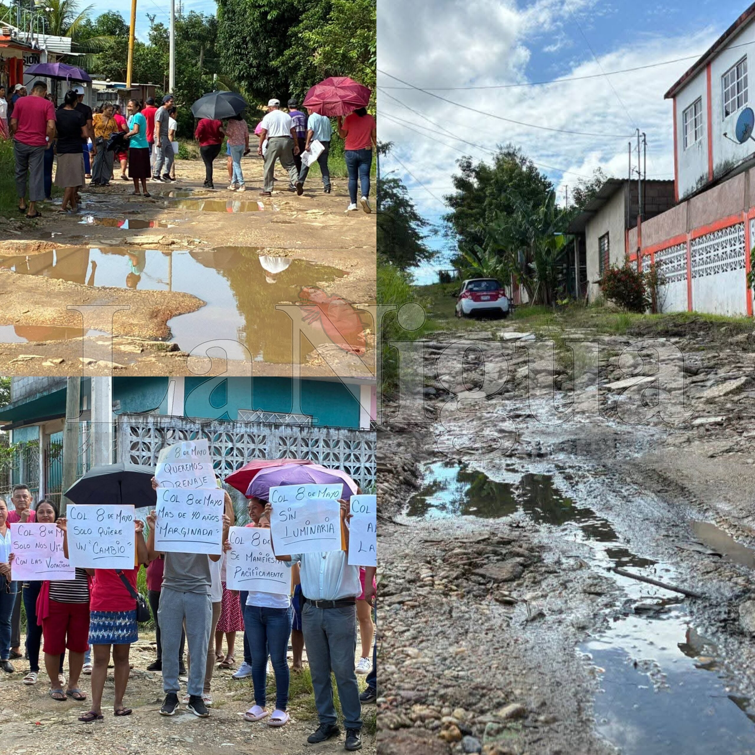Minatitlán, Ver. — Habitantes de la colonia 8 de Mayo en Minatitlán denunciaron cuatro décadas de rezago y olvido gubernamental, al señalar que hasta la fecha no cuentan con drenaje, calles pavimentadas ni alumbrado público funcional.