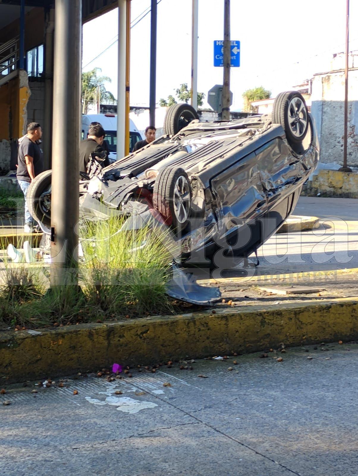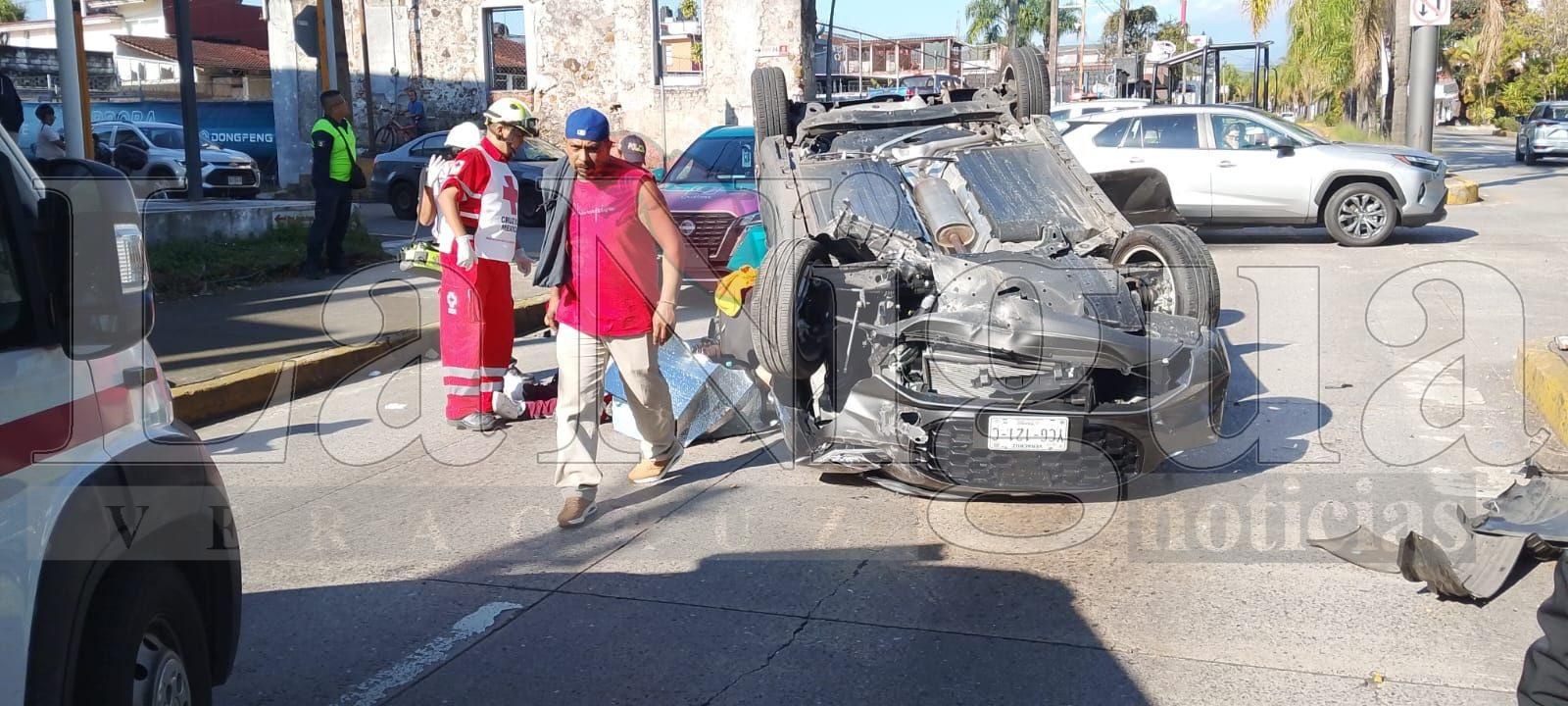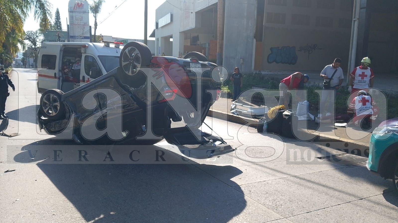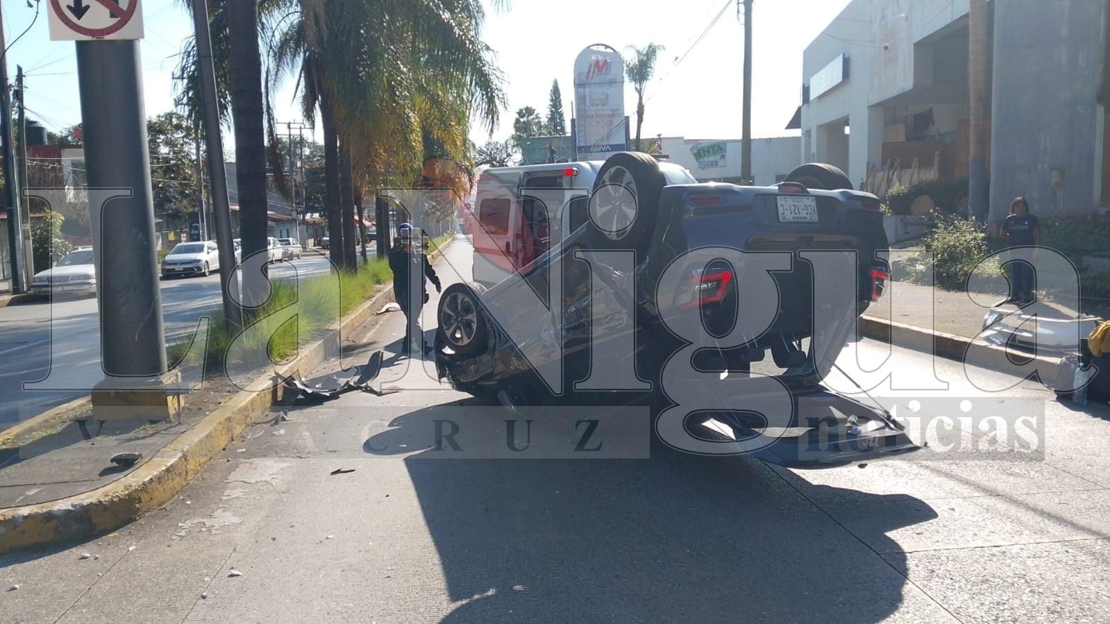 Córdoba, Ver.— Un aparatoso accidente vial se registró la tarde de este día en el cruce de calle 24 y bulevar Fundadores, en la colonia Maestros, luego de que un automóvil fuera impactado por otro vehículo que se dio a la fuga, provocando que la unidad afectada perdiera el control y terminara volcada tras chocar contra un semáforo.