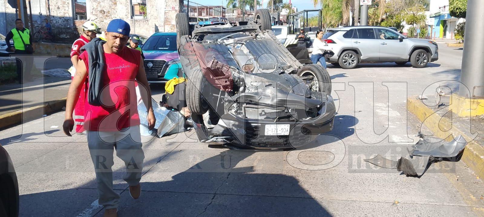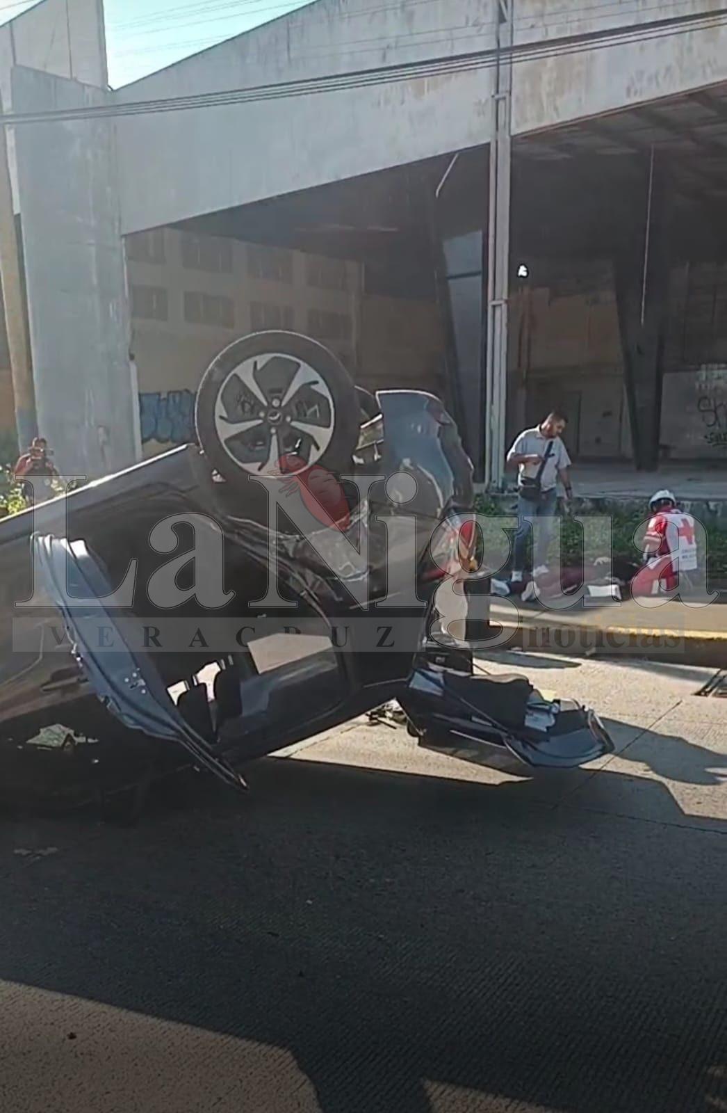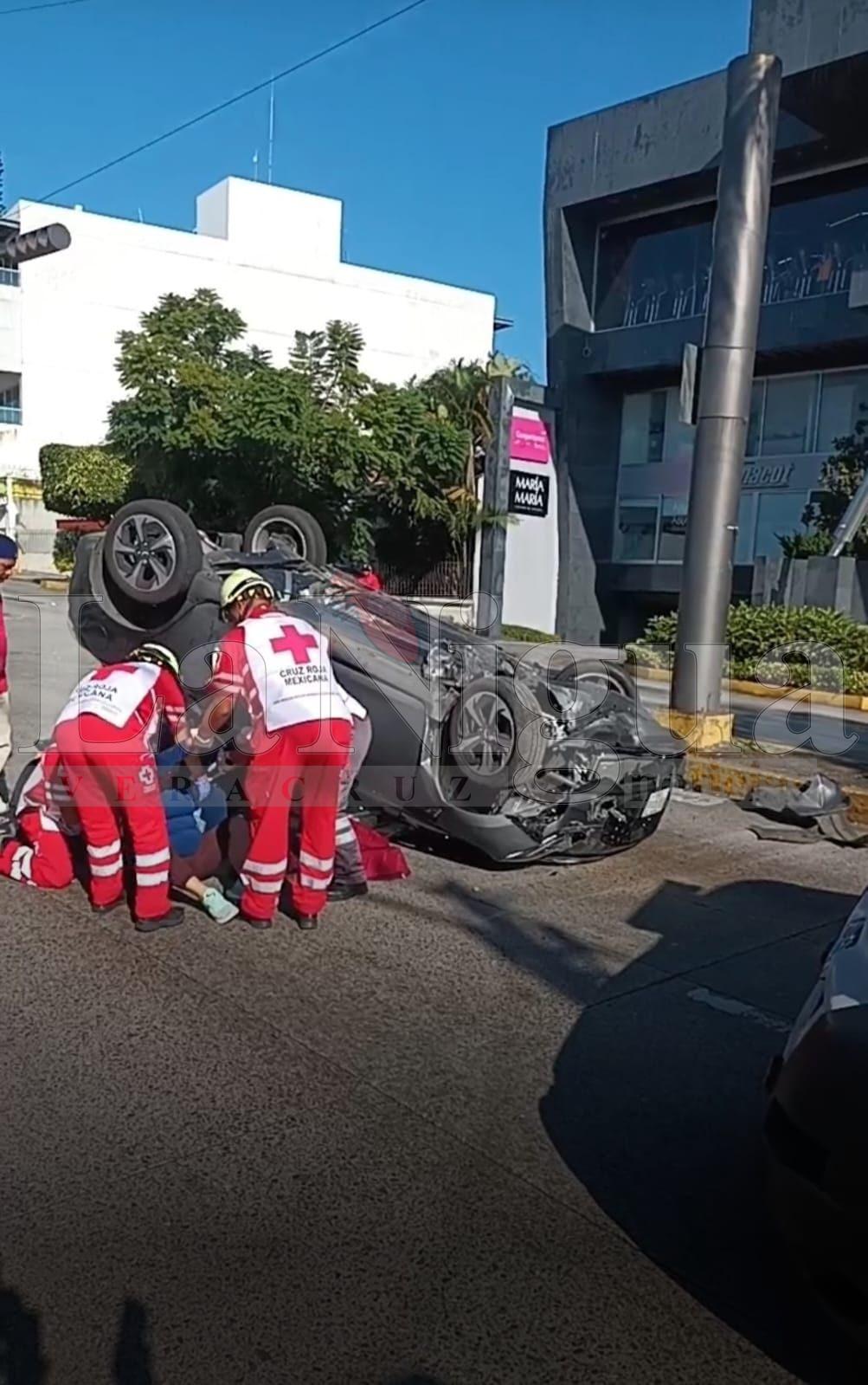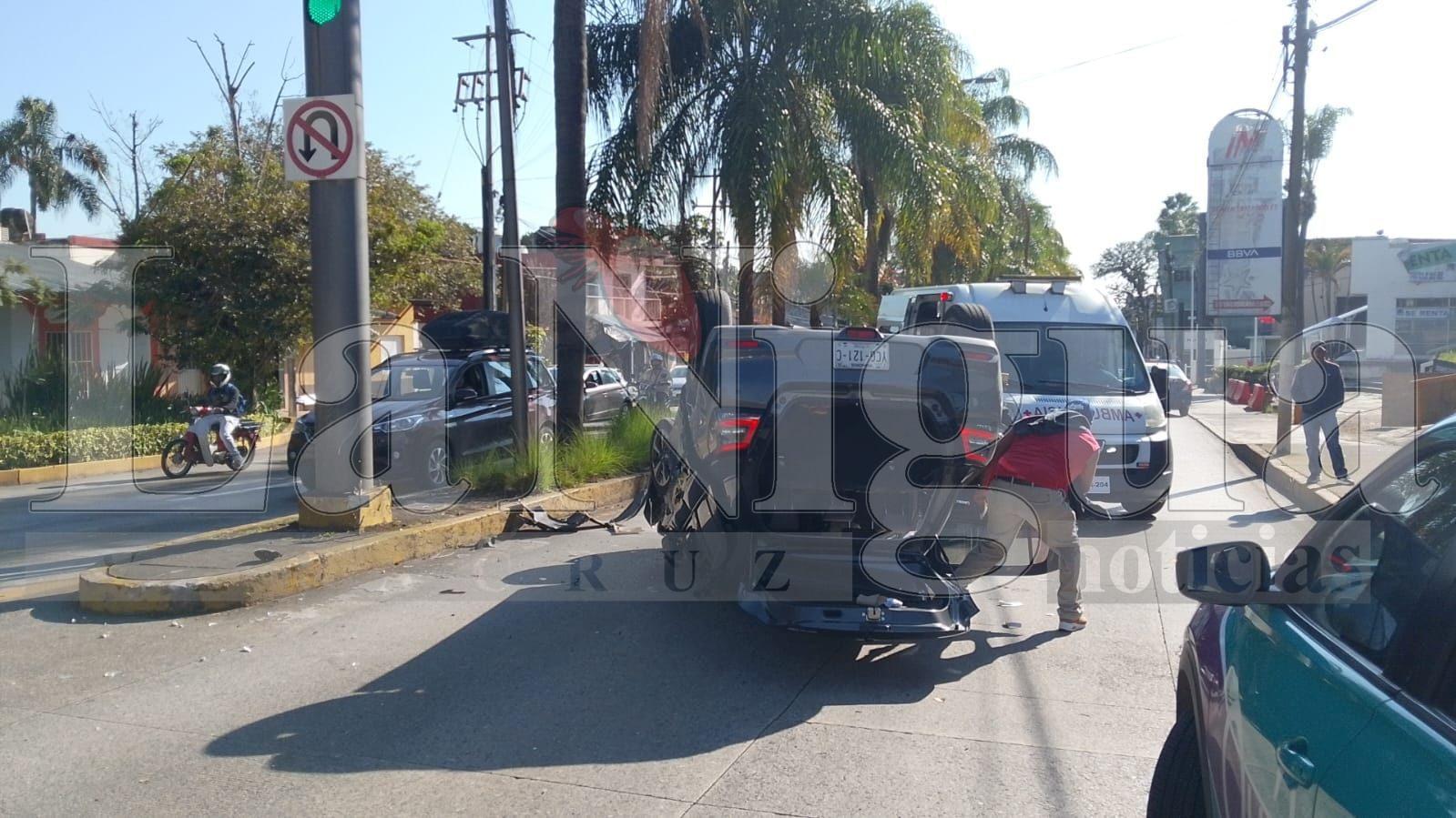 Córdoba, Ver.— Un aparatoso accidente vial se registró la tarde de este día en el cruce de calle 24 y bulevar Fundadores, en la colonia Maestros, luego de que un automóvil fuera impactado por otro vehículo que se dio a la fuga, provocando que la unidad afectada perdiera el control y terminara volcada tras chocar contra un semáforo.