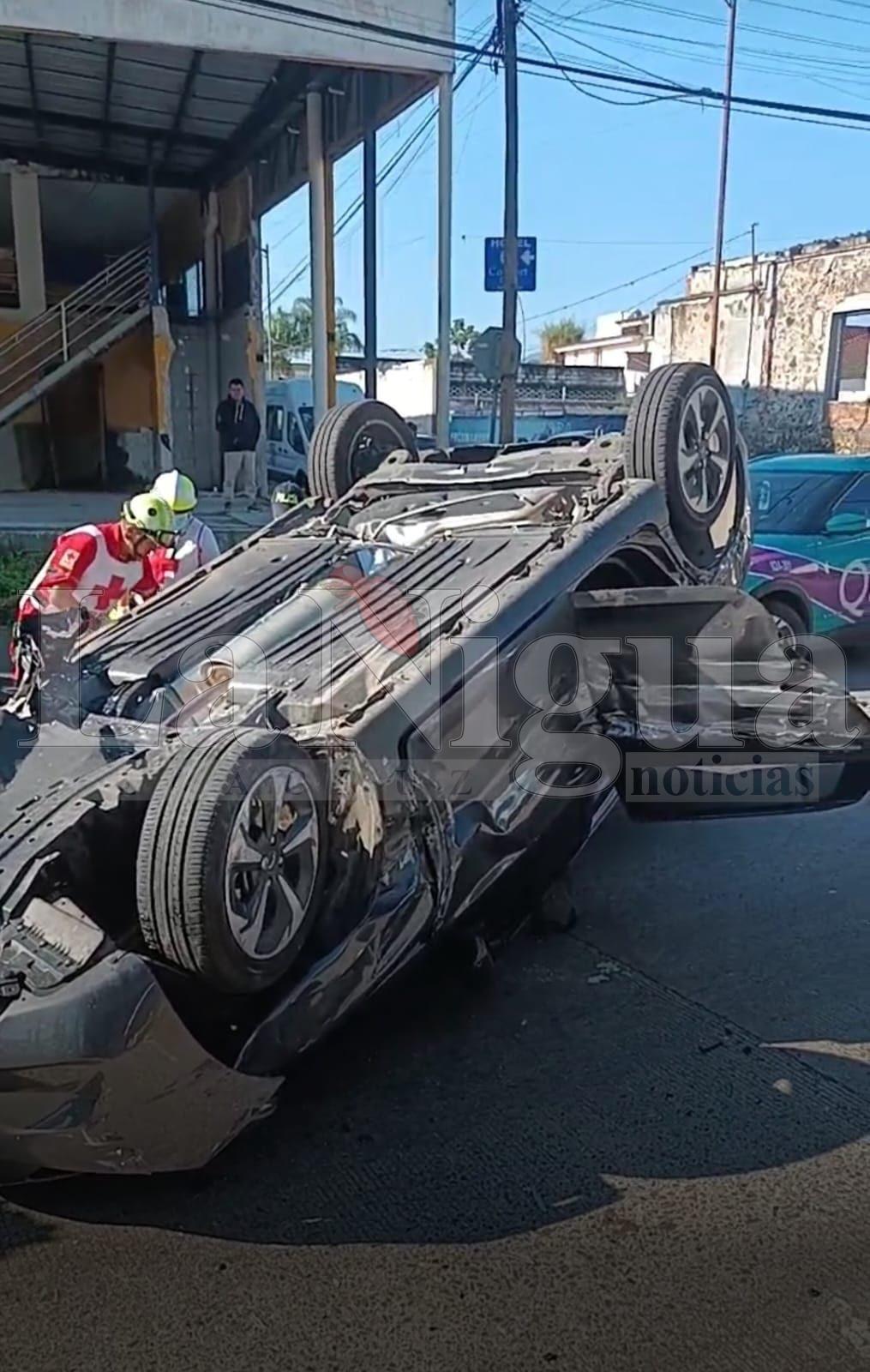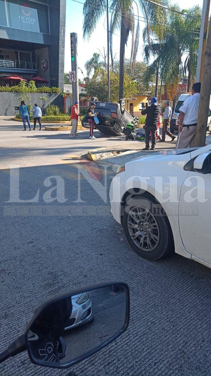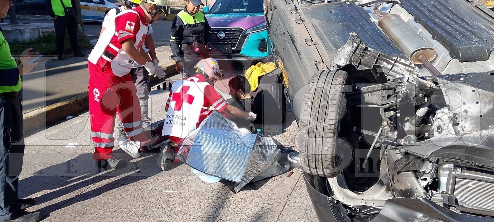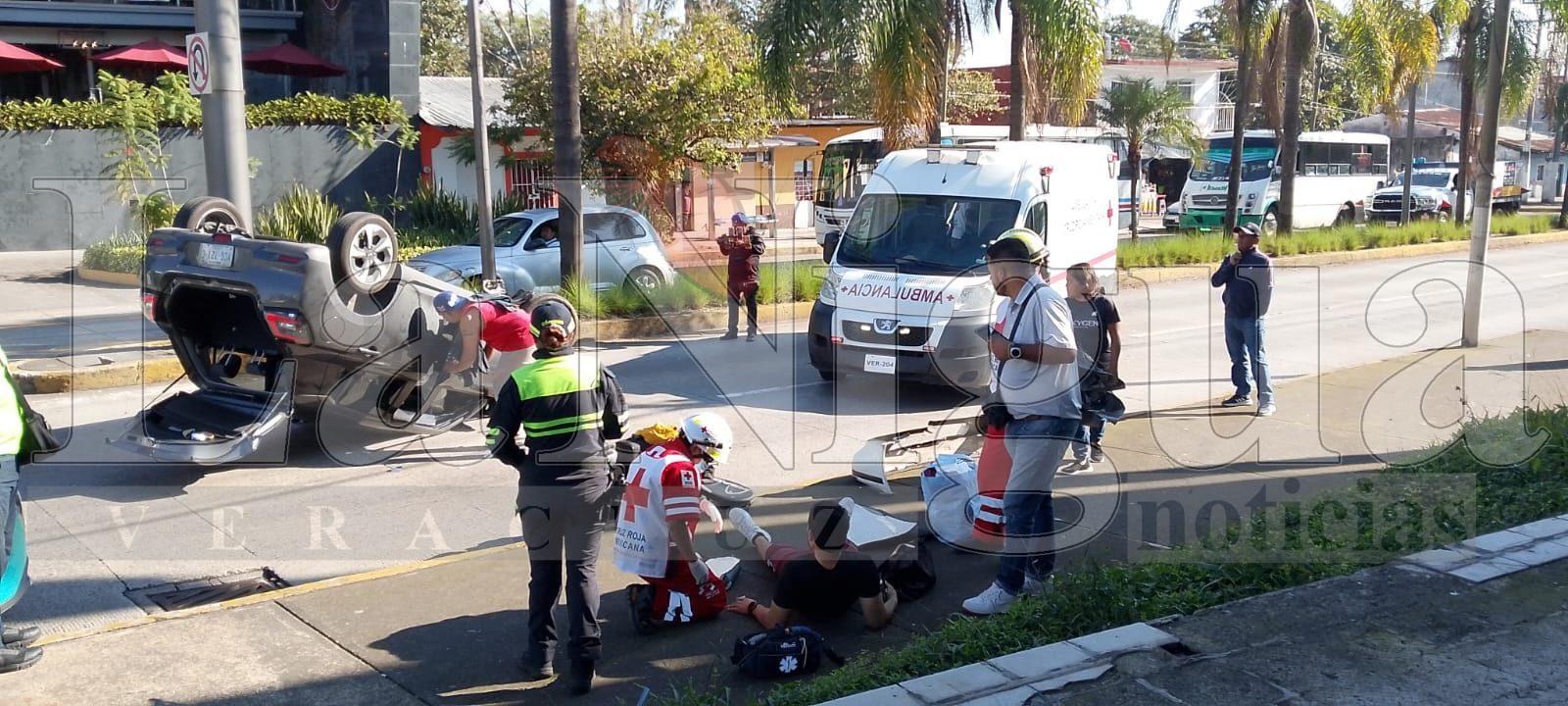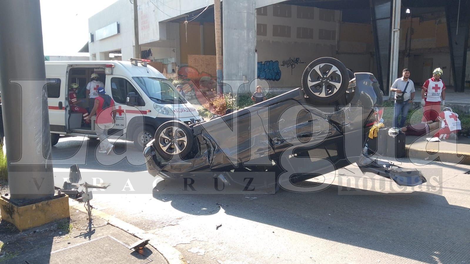 Córdoba, Ver.— Un aparatoso accidente vial se registró la tarde de este día en el cruce de calle 24 y bulevar Fundadores, en la colonia Maestros, luego de que un automóvil fuera impactado por otro vehículo que se dio a la fuga, provocando que la unidad afectada perdiera el control y terminara volcada tras chocar contra un semáforo.