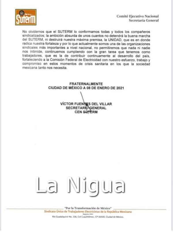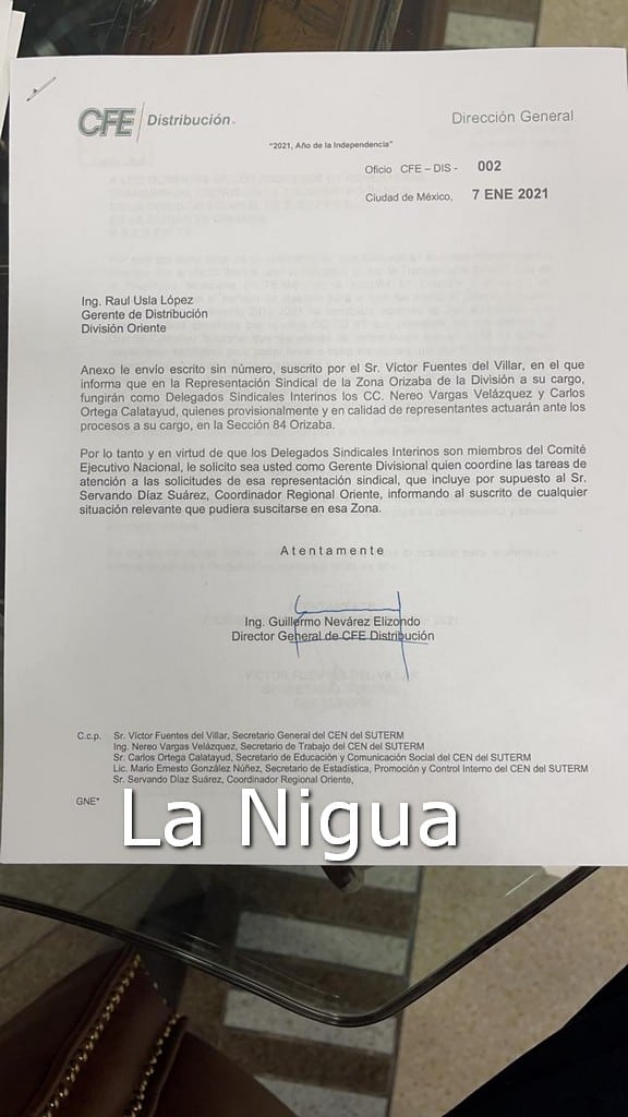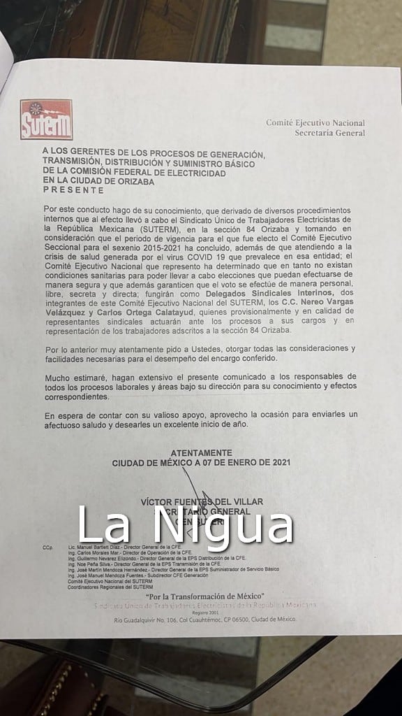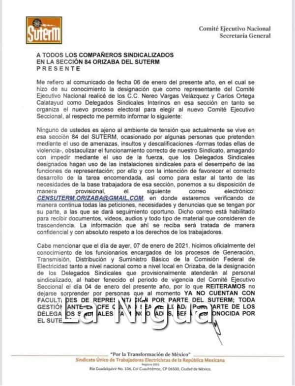 El escrito dirigido a los Gerentes de los Procesos de Generación Transmisión, Distribución y Suministro básico de la Comisión Federal de Electricidad, expresa que dada la carga de trabajo que tiene el SUTERM instruyó al Secretario del Trabajo y de Educación, Nereo Vargas Velásquez y Carlos Ortega Calatayud, regresar a sus cargos en el Comité Ejecutivo Nacional, luego de fungir como delegados en la sección 84 de Orizaba, en donde atendían las necesidades de este gremio, toda vez que concluyó este 04 de enero el periodo del Comité Ejecutivo Seccional.