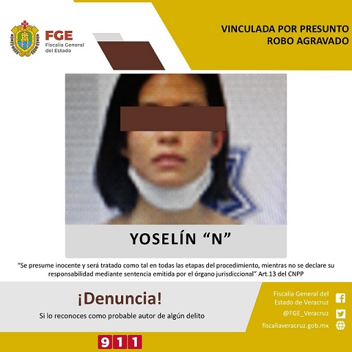 Orizaba, Ver., 1 de Julio de 2020.- La Fiscalía General del Estado (FGE) logró la vinculación a proceso de Yoselín «N», por el probable delito de robo agravado.