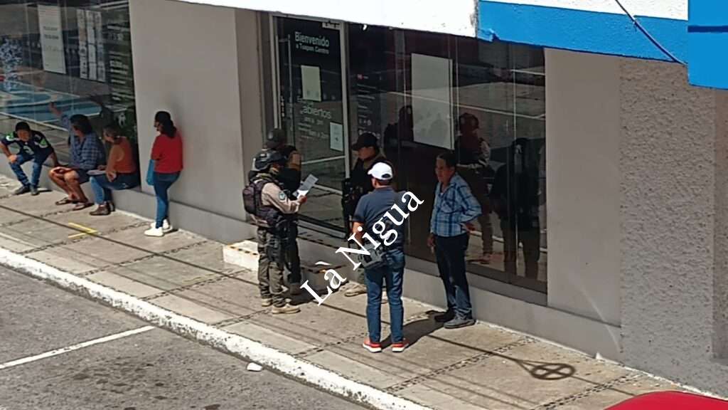 Arribando, elementos de la Fuerza Civil quiénes acordonaron la zona con relación a la sucursal bancaria; para preservar los indicios en el escenario del delito.