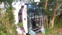 Se informó que el autobús de la línea Futura, marcada con el número económico 3116, terminó entre el asfalto y la maleza, volcado sobre su costado izquierdo.