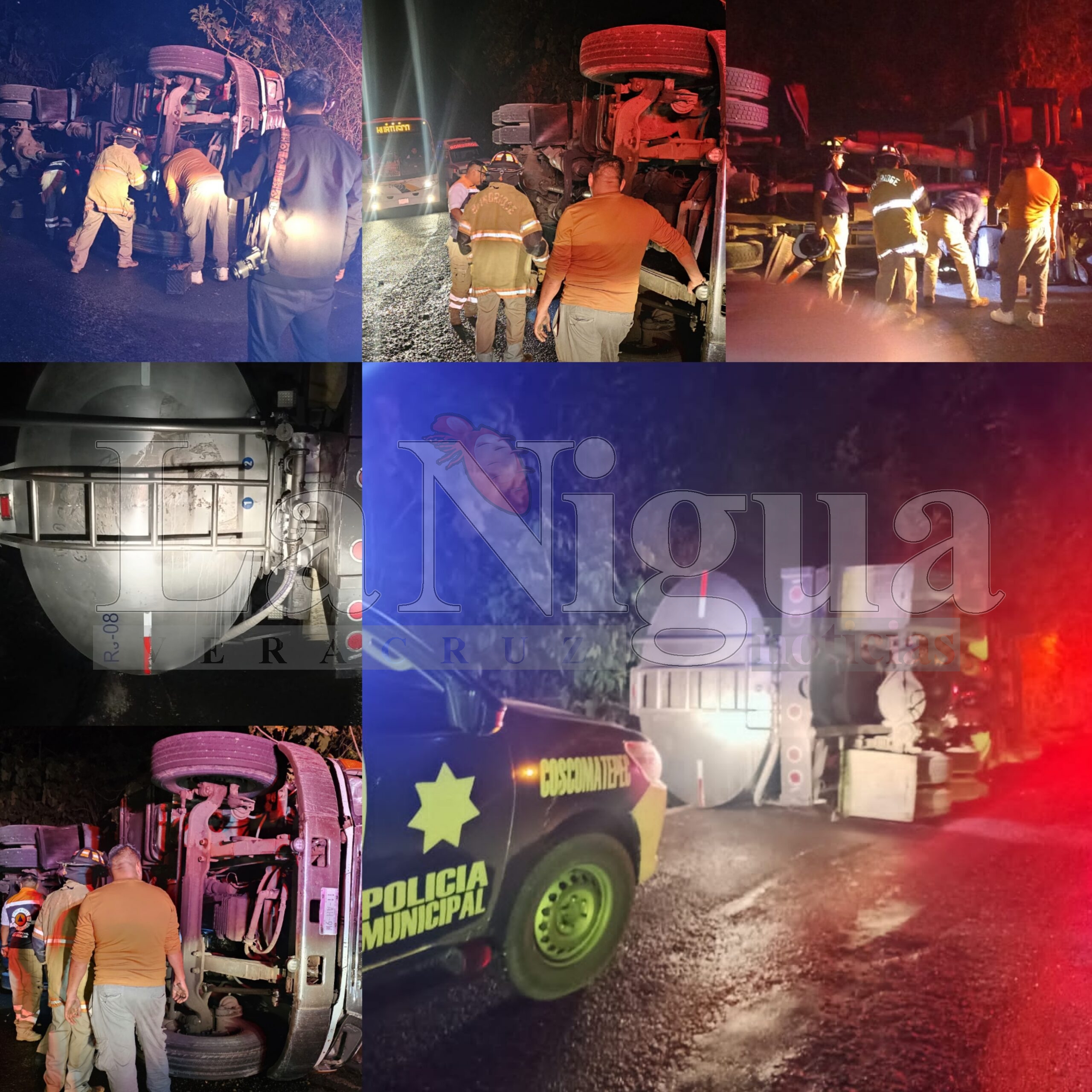 Coscomatepec, Ver.— La noche del jueves se registró la volcadura de una pipa sobre la carretera federal Huatusco–Coscomatepec, generando afectaciones a la circulación vehicular en la zona.