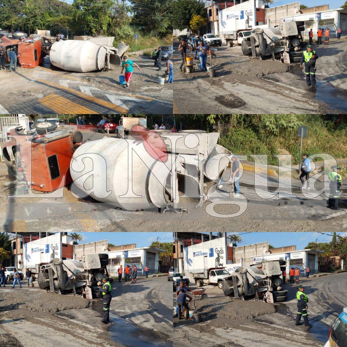 Córdoba, Ver.- La tarde de este día, una revolvedora cargada con mezcla de cemento volcó al perder estabilidad cuando el operador intentó tomar una vuelta sobre la carretera Córdoba–Amatlán, a la altura de la calle 49, procedente del Ingenio San Miguelito.