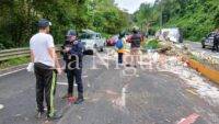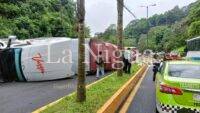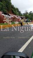 Coatepec, Ver.- Esta mañana un trailer volcó sobre el bulevar Xalapa-Coatepec provocando el cierre de la vialidad en ambos sentidos.
