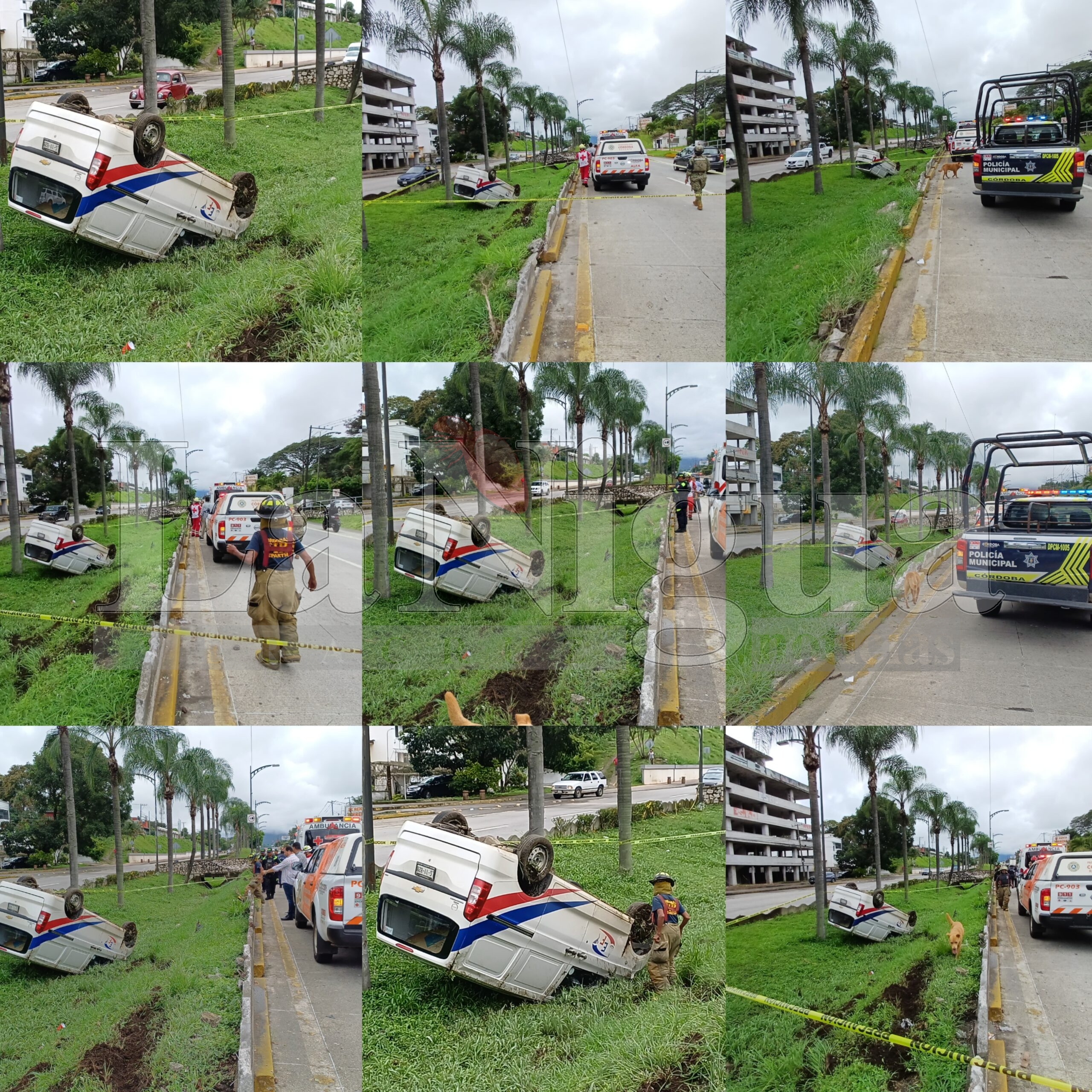 Córdoba, Ver.- Un automóvil volcó este jueves en el boulevard Tratados de Córdoba, en el carril de bajada antes de llegar a la caseta de retén de la Policía Municipal, debido al exceso de velocidad, la falta de pericia del conductor y el piso mojado, informó la autoridad local.