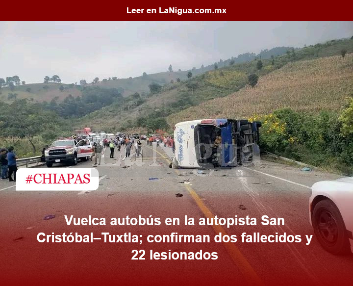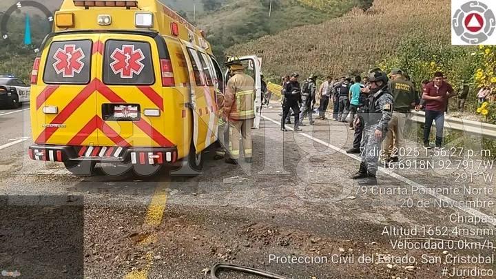 San Cristóbal de Las Casas, Chiapas, a 7 de diciembre de 2025.– Un trágico accidente se registró en el kilómetro 26 de la autopista San Cristóbal–Tuxtla Gutiérrez, donde la volcadura de un autobús dejó como saldo dos personas fallecidas y al menos 22 lesionadas.