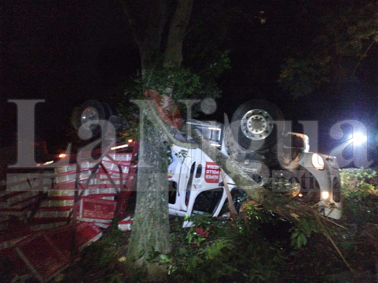 Atoyac Ver.- Un camión cargado de rehas de pollo en pie, sufrió una aparatoso volcaduea bajando el Cerro de Chiquihuite, antes de pasar el puente del mismo nombre, con destino a la empresa Alimentos Pecuarios Neria, en la vecina Paso del Macho.