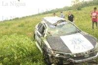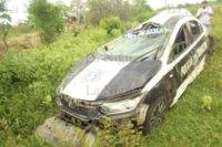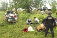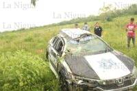 Cinco minutos después, los mismos policías pidieron el apoyo, debido a que la unidad que iba al frente perdió el control, zigzageando por la carretera federal Alazan – Canoas, hasta perder el control, sabiéndose de la cinta asfáltica, dando varias volteretas y terminar chocando contra un árbol.