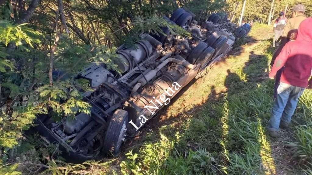 De acuerdo a los primeros reportes, un tráiler que transportaba varías toneladas de maíz perdió el control y se salió de la carpeta asfáltica quedando con las llantas hacía arriba.