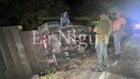 Un tractocamión cargado con varías cabeza de ganado volcó de manera aparatosa esta noche sobre la carretera federal Alazán – Canoas.