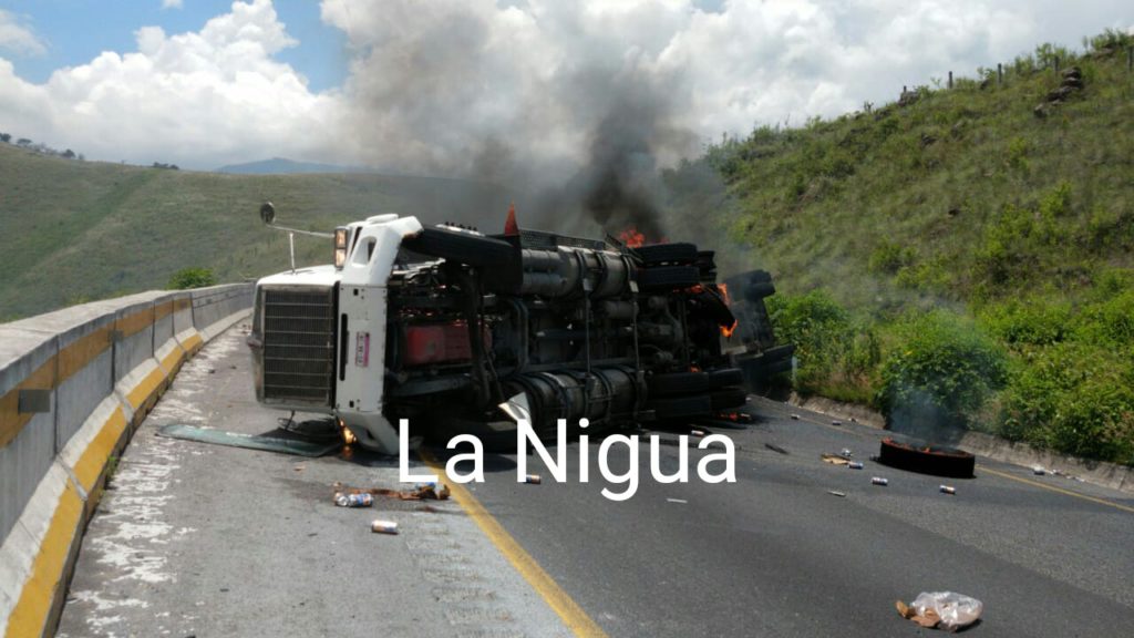 Maltrata, Ver .- La tarde de este lunes en el kilómetro 244 de la autopista Puebla-Veracruz muy cerca del entronque de Maltrata, un trailer cargado con bebidas envasadas volcó y se incendió.