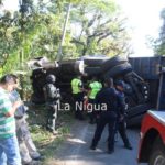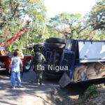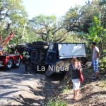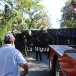 Al llegar al kilómetro 5, a la altura de Monte Salas, el chófer perdió el control de la pesada unidad y volcó, no sin antes chocar contra un poste y una luminaria. Pese al aparatoso percance no hubo lesionados, pero la vialidad se vio totalmente afectada.