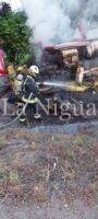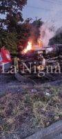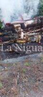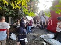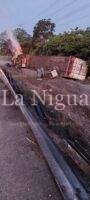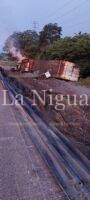 Ixtaczoquitlán, Ver.- La volcadura e incendio de un tractocamión cargado con azúcar, se registró durante la mañana de este miércoles sobre el kilómetro 282 de la autopista Veracruz-México a la altura de la localidad perteneciente a Sumidero.