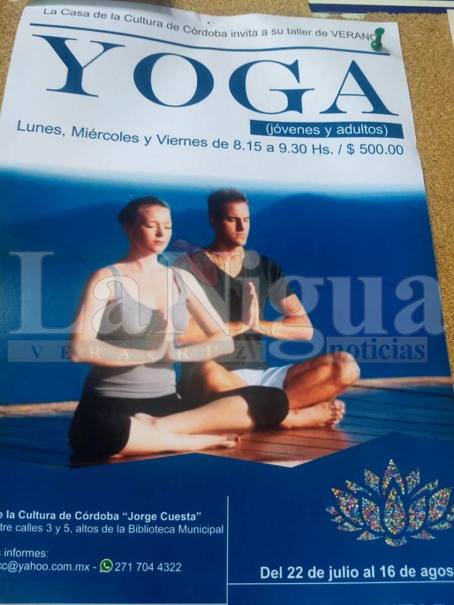 [vc_row][vc_column][vc_column_text]Córdoba ver 23/0719. Se llevará a cabo las sesiones de yoga, los días lunes, miércoles y viernes de 8:15 a 9:30 horas, jóvenes y adultos, con un costo de 500 pesos, del 22 al 16 de agosto, detalles 2717044322