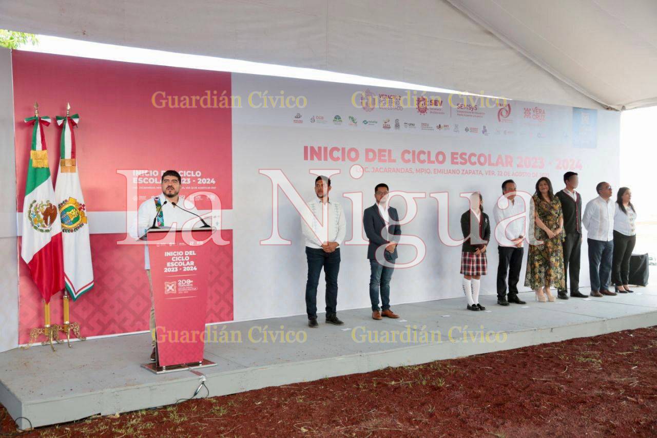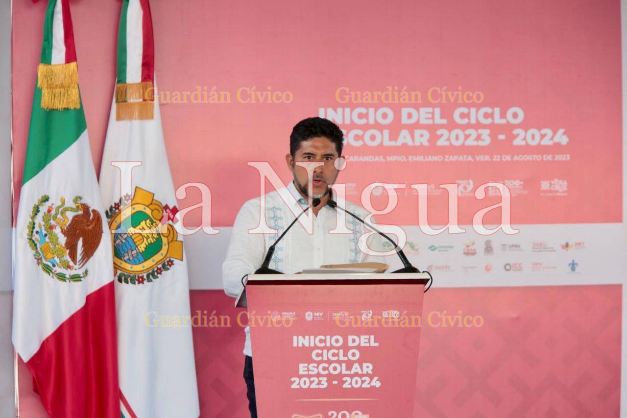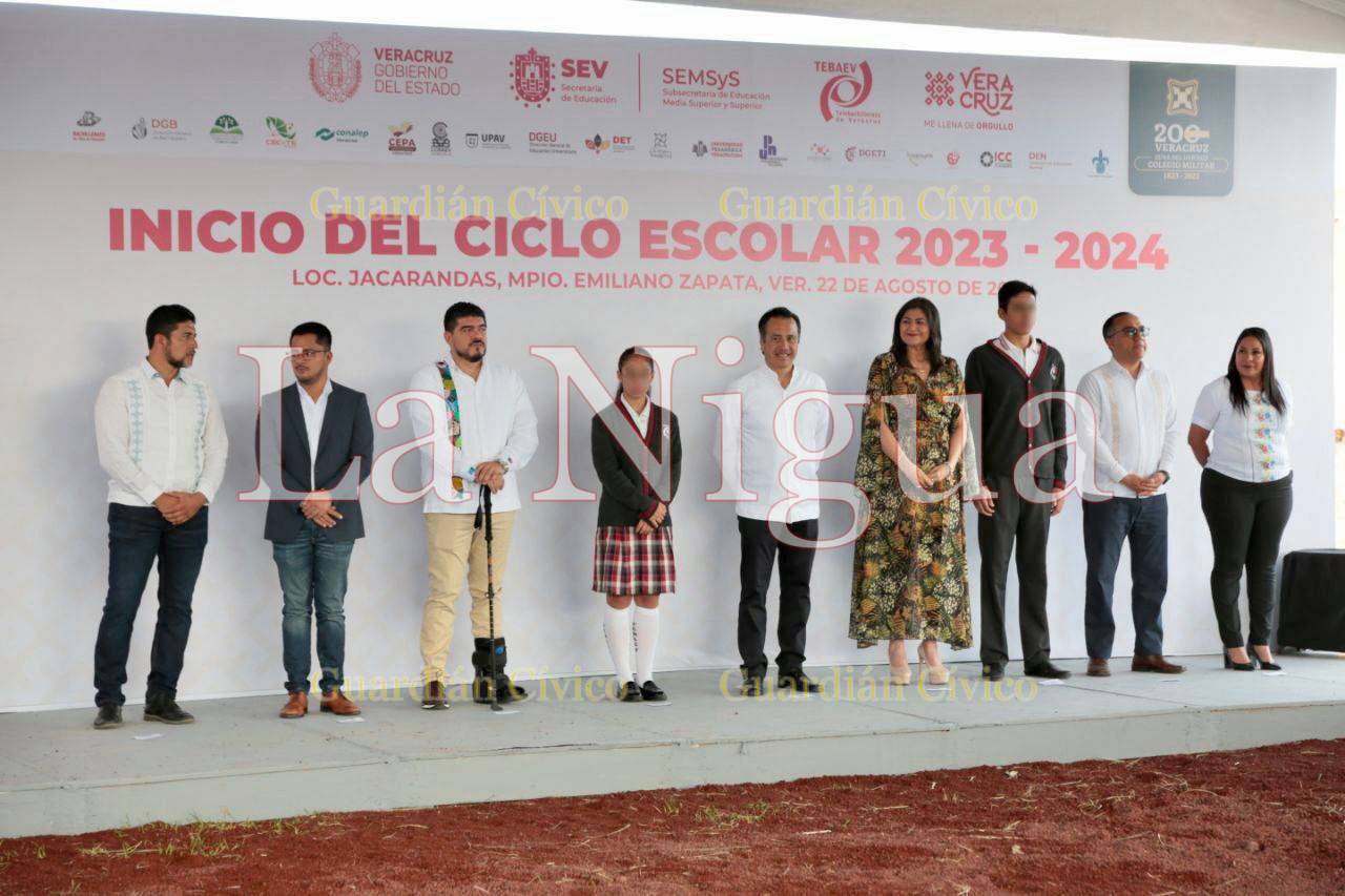 Emiliano Zapata, Ver., 22 de agosto de 2023.- En un acto de gran relevancia para la educación en el estado de Veracruz, el secretario de Educación, Zenyazen Escobar García, encabezó la ceremonia de inauguración del ciclo escolar 2023-2024 para los diferentes subsistemas de Educación Media Superior y Superior. Desde el Telebachillerato “Jacarandas”, con la distinguida presencia de la subsecretaria de Educación Media Superior, Nora Ruvalcaba Gámez, y del gobernador constitucional del Estado de Veracruz, Cuitláhuac García Jiménez, reiteró la importancia que tiene invertir en educación.