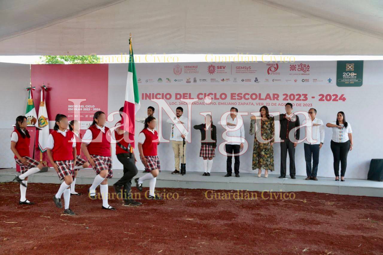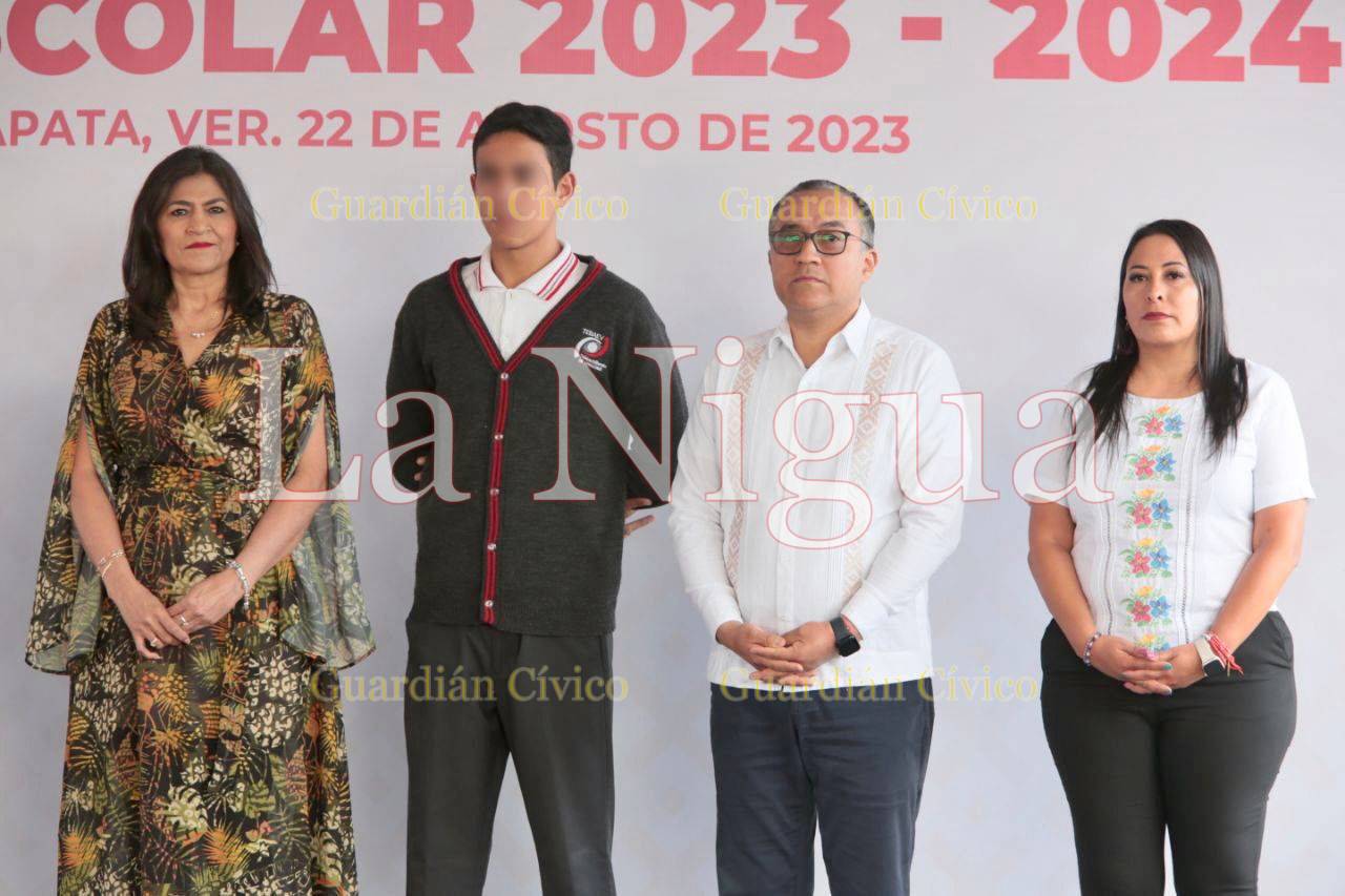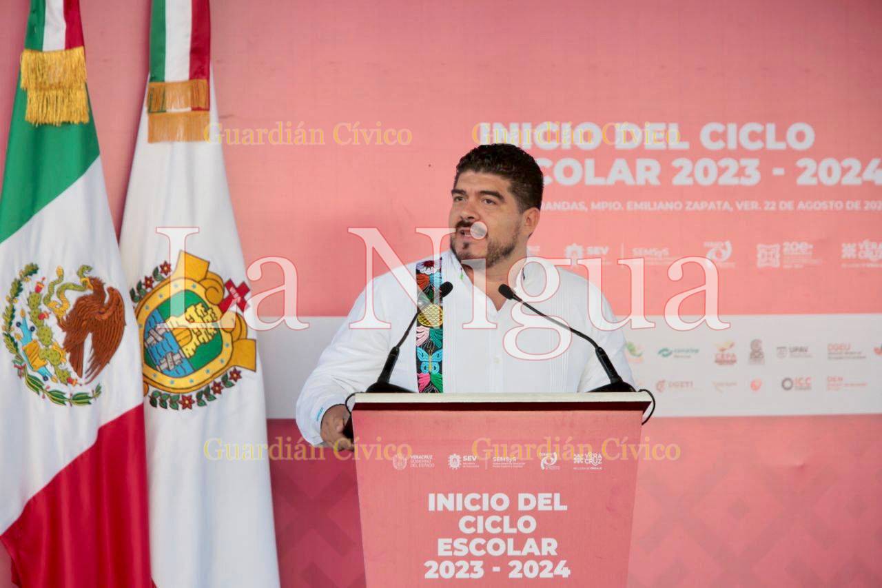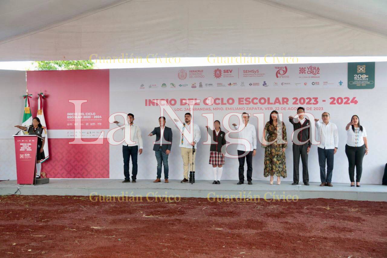 Emiliano Zapata, Ver., 22 de agosto de 2023.- En un acto de gran relevancia para la educación en el estado de Veracruz, el secretario de Educación, Zenyazen Escobar García, encabezó la ceremonia de inauguración del ciclo escolar 2023-2024 para los diferentes subsistemas de Educación Media Superior y Superior. Desde el Telebachillerato “Jacarandas”, con la distinguida presencia de la subsecretaria de Educación Media Superior, Nora Ruvalcaba Gámez, y del gobernador constitucional del Estado de Veracruz, Cuitláhuac García Jiménez, reiteró la importancia que tiene invertir en educación.
